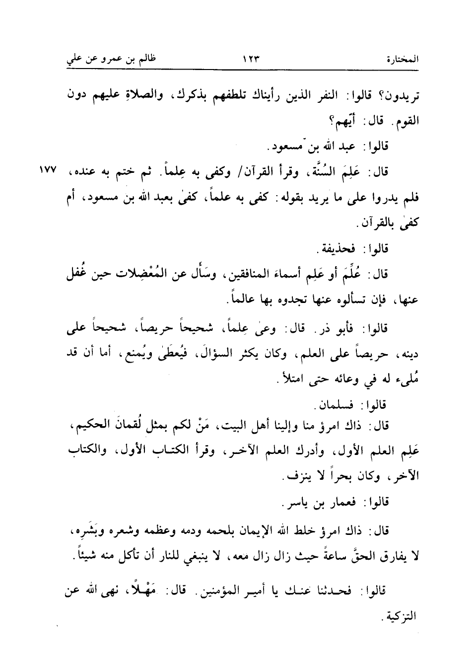 تُرِيدُونَ قَالُوا النَّفَرُ الَّذِينَ رَأَيْنَاكَ تُلَطِّفُهُمْ بِذِكْرِكَ وَالصَّلاةِ عَلَيْهِمْ دُونَ الْقَوْمِ قَالَ أَيُّهُمْ قَالُوا عبد الله بْنُ مَسْعُودٍ قَالَ عَلِمَ السُّنَّةَ وَقَرَأَ الْقُرْآنَ وَكَفَى بِهِ عِلْمًا ثُمَّ خَتَمَ بِهِ عِنْدَهُ فَلَمْ يَدْرُوا عَلَى مَا يُرِيدُ بِقَوْلِهِ كَفَى بِهِ علما كفى بِعَبْد الله بْنِ مَسْعُودٍ أَمْ كَفَى بِالْقُرْآنِ قَالُوا فَحُذَيْفَةُ قَالَ عَلِمَ أَوْ عُلِّمَ أَسْمَاءُ الْمُنَافِقِينَ وَسَأَلَ عَنِ الْمُعْضِلاتِ حِينَ غُفِلَ عَنْهَا فَإِنْ تَسْأَلُوهُ عَنْهَا تَجِدُوهُ بِهَا عَالِمًا قَالُوا فَأَبُو ذَرٍّ قَالَ وَعَى عِلْمًا شَحِيحًا حَرِيصًا شَحِيحًا عَلَى دِينِهِ حَرِيصًا عَلَى الْعِلْمِ وَكَانَ يُكْثِرُ السُّؤَالَ فَيُعْطَى وَيُمْنَعُ أَمَا أَنْ قَدْ مُلِئَ لَهُ فِي وِعَائِهِ حَتَّى امْتَلأَ قَالُوا فَسَلْمَانُ قَالَ ذَاكَ امْرِؤٌ مِنَّا وَإِلَيْنَا أَهْلَ الْبَيْتِ مَنْ لَكُمْ بِمِثْلِ لُقْمَانَ الْحَكِيمِ عَلِمَ الْعِلْمَ الأَوَّلَ وَأَدْرَكَ الْعِلْمَ الآخَرَ وَقَرَأَ الْكِتَابَ الأَوَّلَ وَالْكِتَابَ الآخَرَ وَكَانَ بَحْرًا لَا يُنْزَفُ قَالُوا فَعَمَّارُ بْنُ يَاسِرٍ قَالَ ذَاكَ امْرِؤٌ خَلَطَ اللَّهُ الإِيمَانَ بِلَحْمِهِ وَدَمِهِ وَعَظْمِهِ وَشَعْرِهِ وَبَشَرِهِ لَا يُفَارِقُ الْحَقَّ سَاعَةً حَيْثُ زَالَ زَالَ مَعَهُ لَا يَنْبَغِي لِلنَّارِ أَنْ تَأْكُلَ مِنْهُ شَيْئًا قَالُوا فَحَدِّثْنَا عَنْكَ يَا أَمِيرَ الْمُؤْمِنِينَ قَالَ مَهْلا نَهَى اللَّهُ عَنِ التَّزْكِيَةِ