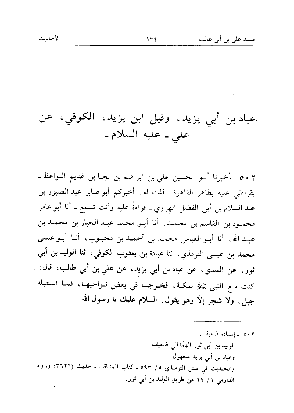 502 - أَخْبَرَنَا أَبُو الْحُسَيْنِ عَلِيُّ بْنُ إِبْرَاهِيمَ بْنِ نَجَا بْنِ غَنَايِمَ الْوَاعِظُ بِقِرَاءَتِي عَلَيْهِ بِظَاهِرِ الْقَاهِرَةِ قُلْتُ لَهُ أخْبركُم أَبُو صابر عبد الصبور بن عبد السَّلَام بْنِ أَبِي الْفَضْلِ الْهَرَوِيُّ قِرَاءَةً عَلَيْهِ وَأَنْتَ تَسْمَعُ أَنا أَبُو عَامِرٍ مَحْمُودُ بْنُ الْقَاسِمِ بن مُحَمَّد أَنا أَبُو مُحَمَّد عبد الْجَبَّار بن مُحَمَّد بن عبد الله أَنا أَبُو الْعَبَّاسِ مُحَمَّدُ بْنُ أَحْمَدَ بْنِ مَحْبُوبٍ أَنَا أَبُو عِيسَى مُحَمَّدُ بْنُ عِيسَى التِّرْمِذِيُّ ثَنَا عُبَادَةُ بْنُ يَعْقُوبَ الْكُوفِيُّ ثَنَا الْوَلِيدُ بْنُ أَبِي ثَوْرٍ عَنِ السُّدِّيِّ عَنْ عَبَّادِ بْنِ يَزِيدَ عَنْ عَلِيِّ بْنِ أَبِي طَالِبٍ قَالَ كُنْتُ مَعَ النَّبِيِّ صَلَّى اللَّه عَلَيْهِ وَسَلَّمَ بِمَكَّةَ فَخَرَجْنَا فِي بَعْضِ نَوَاحِيهَا فَمَا اسْتَقَبَلَهُ جَبَلٌ وَلَا شَجَرٌ إِلَّا وَهُوَ يَقُولُ السَّلامُ عَلَيْكَ يَا رَسُولَ اللَّهِ