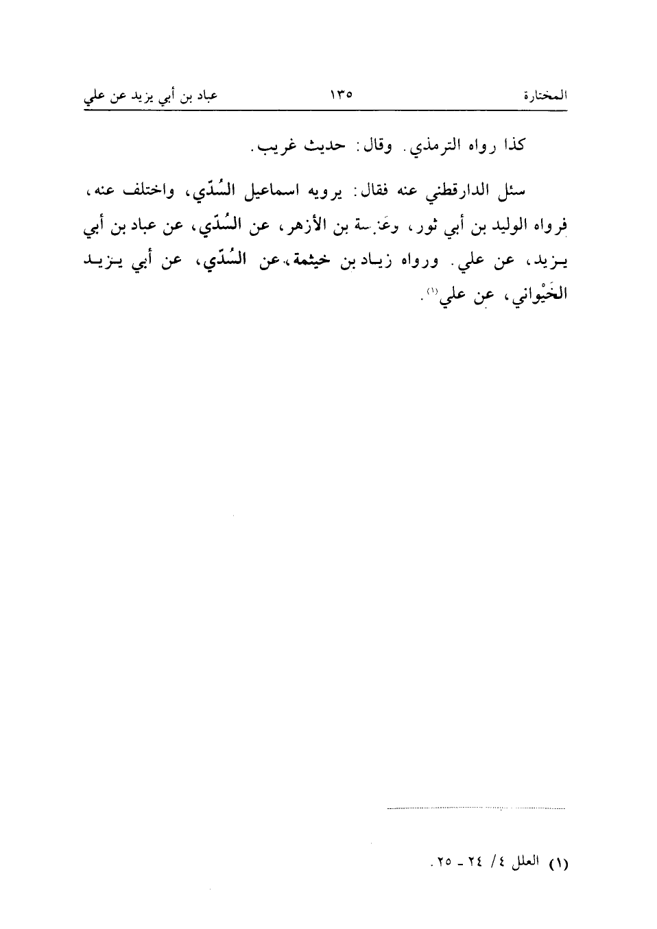 كَذَا رَوَاهُ التِّرْمِذِيُّ وَقَالَ حَدِيثٌ غَرِيبٌ سُئِلَ الدَّارَقُطْنِيُّ عَنْهُ فَقَالَ يَرْوِيهِ إِسْمَاعِيلُ السُّدِّيُّ وَاخْتُلِفَ عَنْهُ فَرَوَاهُ الْوَلِيدُ بْنُ أَبِي ثَوْرٍ وَعَنْبَسَةُ بْنُ الأَزْهَرِ عَنِ السُّدِّيِّ عَنْ عَبَّادِ بْنِ أَبِي يَزِيدَ عَنْ عَلِيٍّ وَرَوَاهُ زِيَادُ بْنُ خَيْثَمَةَ عَنِ السُّدِّيِّ عَنْ أَبِي يَزِيدَ الْخَيْوَانِيِّ عَن عَليّ (إِسْنَاده ضَعِيف)
