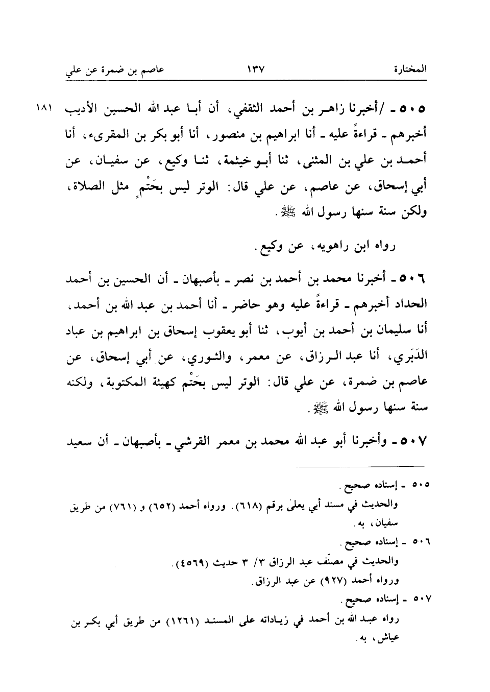 506 - أخبرنَا مُحَمَّد بن احْمَد بن نصر بأصببهان أَنَّ الْحُسَيْنَ بْنَ أَحْمَدَ الْحَدَّادَ أَخْبَرَهُمْ قِرَاءَةً عَلَيْهِ وَهُوَ حَاضر أَنا أَحْمد بن عبد الله بْنِ أَحْمَدَ أَنَا سُلَيْمَانُ بْنُ أَحْمَدَ بْنِ أَيُّوبَ ثَنَا أَبُو يَعْقُوبَ إِسْحَاقُ بْنُ إِبْرَاهِيمَ بْنِ عَبَّادٍ الدَّبَرِيُّ أَنَا عَبْدُ الرَّزَّاقِ عَنْ مَعْمَرٍ وَالثَّوْرِيِّ عَنْ أَبِي إِسْحَاقَ عَنْ عَاصِمِ بْنِ ضَمْرَةَ عَنْ عَلِيٍّ قَالَ الْوِتْرُ لَيْسَ بِحَتْمٍ كَهَيْئَةِ الْمَكْتُوبَةِ وَلَكِنَّهُ سُنَّةٌ سَنَّهَا رَسُولُ الله صلى الله عَلَيْهِ وَسلم (إِسْنَاده صَحِيح)