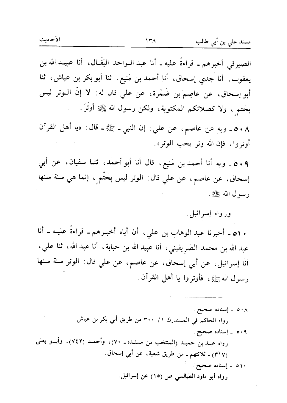 510 - أخبرنَا عبد الْوَهَّاب بْنُ عَلِيٍّ أَنَّ أَبَاهُ أَخْبَرَهُمْ قِرَاءَةً عَلَيْهِ أَنا عبد الله بْنُ مُحَمَّدٍ الصَّرِيفِينِيُّ أَنَا عُبَيْدُ اللَّهِ بْنُ حبابة أَنا عبد الله ثَنَا عَلِيٌّ أَنَا إِسْرَائِيلُ عَنْ أَبِي إِسْحَاقَ عَنْ عَاصِمٍ عَنْ عَلِيٍّ قَالَ الْوِتْرُ سُنَّةٌ سَنَّهَا رَسُولُ اللَّهِ صَلَّى اللَّه عَلَيْهِ وَسَلَّمَ فَأَوْتِرُوا يَا أَهْلَ الْقُرْآنِ