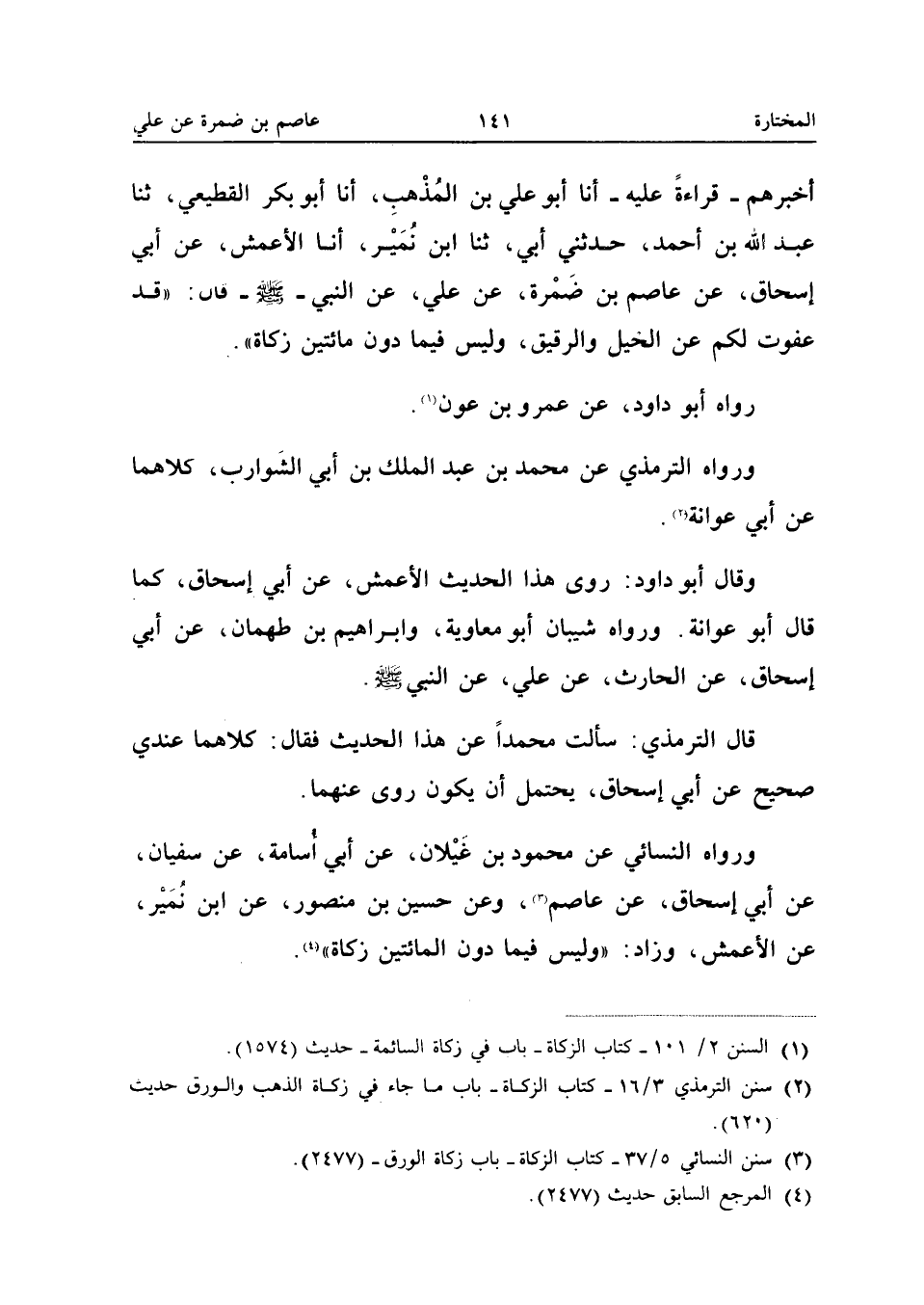 رَوَاهُ أَبُو دَاوُدَ عَنْ عَمْرِو بْنِ عون وَرَوَاهُ التِّرْمِذِيّ عَن مُحَمَّد بن عبد الْملك بْنِ أَبِي الشَّوَارِبِ كِلاهُمَا عَنْ أَبِي عَوَانَةَ وَقَالَ أَبُو دَاوُدَ رَوَى هَذَا الْحَدِيثَ الأَعْمَشُ عَنْ أَبِي إِسْحَاقَ كَمَا قَالَ أَبُو عَوَانَةَ وَرَوَاهُ شَيْبَانُ أَبُو مُعَاوِيَةَ وَإِبْرَاهِيمُ بْنُ طَهْمَانَ عَنْ أَبِي إِسْحَاقَ عَنِ الْحَارِثِ عَنْ عَلِيٍّ عَنِ النَّبِيِّ صَلَّى اللَّهُ عَلَيْهِ وَسَلَّمَ قَالَ التِّرْمِذِيُّ سَأَلْتُ مُحَمَّدًا عَنْ هَذَا الْحَدِيثِ فَقَالَ كِلاهُمَا عِنْدِي صَحِيحٌ عَنْ أَبِي إِسْحَاقَ يُحْتَمَلُ أَنْ يَكُونَ رَوَى عَنْهُمَا وَرَوَاهُ النَّسَائِيُّ عَنْ مَحْمُودِ بْنِ غَيْلانَ عَنْ أَبِي أُسَامَةَ عَنْ سُفْيَانَ عَنْ أَبِي إِسْحَاقَ عَنْ عَاصِمٍ وَعَنْ حُسَيْنِ بْنِ مَنْصُورٍ عَنِ ابْنِ نُمَيْرٍ عَنِ الأَعْمَشِ وَزَادَ وَلَيْسَ فِيمَا دُونَ الْمِائَتَيْنِ زَكَاةٌ (إِسْنَاده صَحِيح)