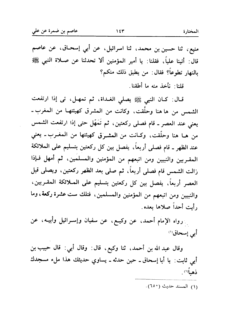 مَنِيعٍ ثَنَا حُسَيْنُ بْنُ مُحَمَّدٍ ثَنَا إِسْرَائِيلُ عَنْ أَبِي إِسْحَاقَ عَنْ عَاصِمٍ قَالَ أَتَيْنَا عَلِيًّا فَقُلْنَا يَا أَمِيرَ الْمُؤْمِنِينَ أَلَا تُحَدِّثُنَا عَنْ صَلاةِ النَّبِيِّ صَلَّى اللَّه عَلَيْهِ وَسَلَّمَ بِالنَّهَارِ تَطَوُّعًا فَقَالَ مَنْ يُطِيقُ ذَلِكَ مِنْكُمْ قُلْنَا نَأْخُذُ مِنْهُ مَا أَطَقْنَا قَالَ كَانَ النَّبِيُّ صَلَّى اللَّه عَلَيْهِ وَسَلَّمَ يُصَلِّي الْغَدَاةَ ثُمَّ تَمَهَّلَ حَتَّى إِذَا ارْتَفَعَتِ الشَّمْسُ مِنْ هَا هُنَا وَحَلَّقَتْ وَكَانَتْ مِنَ الْمَشْرِقِ كَهَيْئَتِهَا مِنَ الْمَغْرِبِ يَعْنِي عِنْدَ الْعَصْرِ قَامَ فَصَلَّى رَكْعَتَيْنِ ثُمَّ تَمَهَّلَ حَتَّى إِذَا ارْتَفَعَتِ الشَّمْسُ مِنْ هَا هُنَا وَحَلَّقَتْ وَكَانَتْ مِنَ الْمَشْرِقِ كَهَيْئَتِهَا مِنَ الْمَغْرِبِ يَعْنِي عِنْدَ الظُّهْرِ قَامَ فَصَلَّى أَرْبَعًا يَفْصِلُ بَيْنَ كُلِّ رَكْعَتَيْنِ بِتَسْلِيمٍ عَلَى الْمَلائِكَةِ الْمُقَرَّبِينَ وَالنَّبِيِّينَ وَمَنِ اتَّبَعَهُمْ مِنَ الْمُؤْمِنِينَ وَالْمُسْلِمِينَ ثُمَّ أَمْهَلَ فَإِذَا زَالَتِ الشَّمْسُ قَامَ فَصَلَّى أَرْبَعًا ثُمَّ صَلَّى بَعْدَ الظُّهْرِ رَكْعَتَيْنِ وَيُصَلِّي قَبْلَ الْعَصْرِ أَرْبَعًا يَفْصِلُ بَيْنَ كُلِّ رَكْعَتَيْنِ بِتَسْلِيمٍ عَلَى الْمَلائِكَةِ الْمُقَرَّبِينَ وَالنَّبِيِّينَ وَمَنِ اتَّبَعَهُمْ مِنَ الْمُؤْمِنِينَ وَالْمُسْلِمِينَ فَتِلْكَ سِتَّ عَشْرَةَ رَكْعَةً وَمَا رَأَيْتُ أَحَدًا صَلَّاهَا بَعْدَهُ