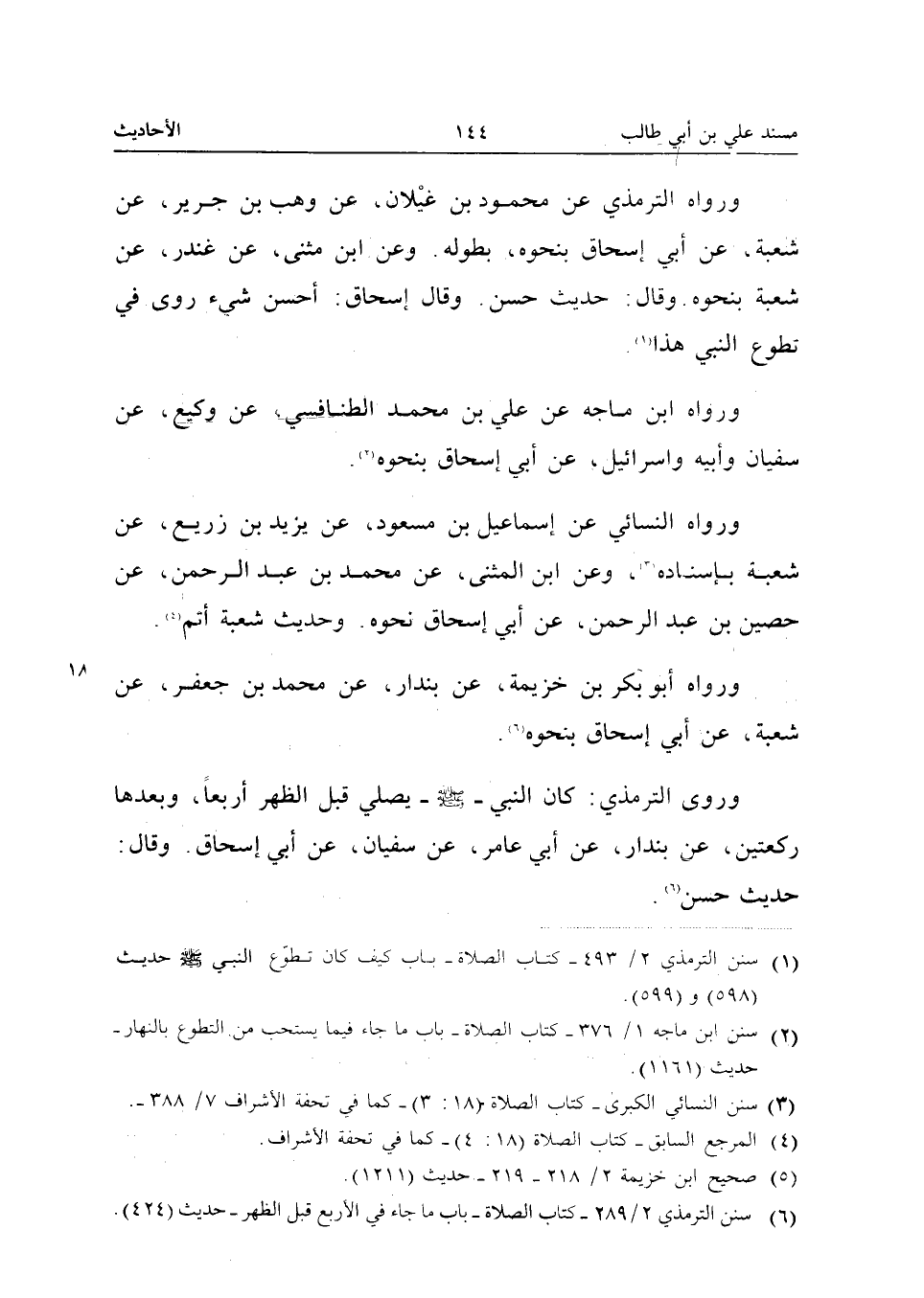 وَرَوَاهُ التِّرْمِذِيُّ عَنْ مَحْمُودِ بْنِ غَيْلانَ عَنْ وَهْبِ بْنِ جَرِيرٍ عَنْ شُعْبَةَ عَنْ أَبِي إِسْحَاقَ بِنَحْوِهِ بِطُولِهِ وَعَنِ ابْنِ مُثَنَّى عَنْ غُنْدَرٍ عَنْ شُعْبَةَ بِنَحْوِهِ وَقَالَ حَدِيثٌ حَسَنٌ وَقَالَ إِسْحَاقُ أَحْسَنُ شَيْءٍ رُوِيَ فِي تَطَوُّعِ النَّبِيِّ هَذَا وَرَوَاهُ ابْنُ مَاجَهْ عَنْ عَلِيِّ بْنِ مُحَمَّدٍ الطَّنَافِسِيِّ عَنْ وَكِيعٍ عَنْ سُفْيَانَ وَأَبِيهِ وَإِسْرَائِيلَ عَنْ أَبِي إِسْحَاقَ بِنَحْوِهِ وَرَوَاهُ النَّسَائِيُّ عَنْ إِسْمَاعِيلَ بْنِ مَسْعُودٍ عَنْ يَزِيدَ بْنِ زُرَيْعٍ عَنْ شُعْبَةَ بِإِسْنَادِهِ وَعَنِ ابْنِ الْمثنى عَن مُحَمَّد بن عبد الرَّحْمَن عَن حُصَيْن بن عبد الرَّحْمَن عَنْ أَبِي إِسْحَاقَ نَحْوَهُ وَحَدِيثُ شُعْبَةَ أَتَمُّ وَرَوَاهُ أَبُو بَكْرِ بْنُ خُزَيْمَةَ عَنْ بُنْدَارٍ عَنْ مُحَمَّدِ بْنِ جَعْفَرٍ عَنْ شُعْبَةَ عَنِ أَبِي إِسْحَاقَ بِنَحْوِهِ وَرَوَى التِّرْمِذِيُّ كَانَ النَّبِيُّ صَلَّى اللَّه عَلَيْهِ وَسَلَّمَ يُصَلِّي قَبْلَ الظُّهْرِ أَرْبَعًا وَبَعْدَهَا رَكْعَتَيْنِ عَنْ بُنْدَارٍ عَنْ أَبِي عَامِرٍ عَنْ سُفْيَانَ عَنْ أَبِي إِسْحَاقَ وَقَالَ حَدِيث حسن