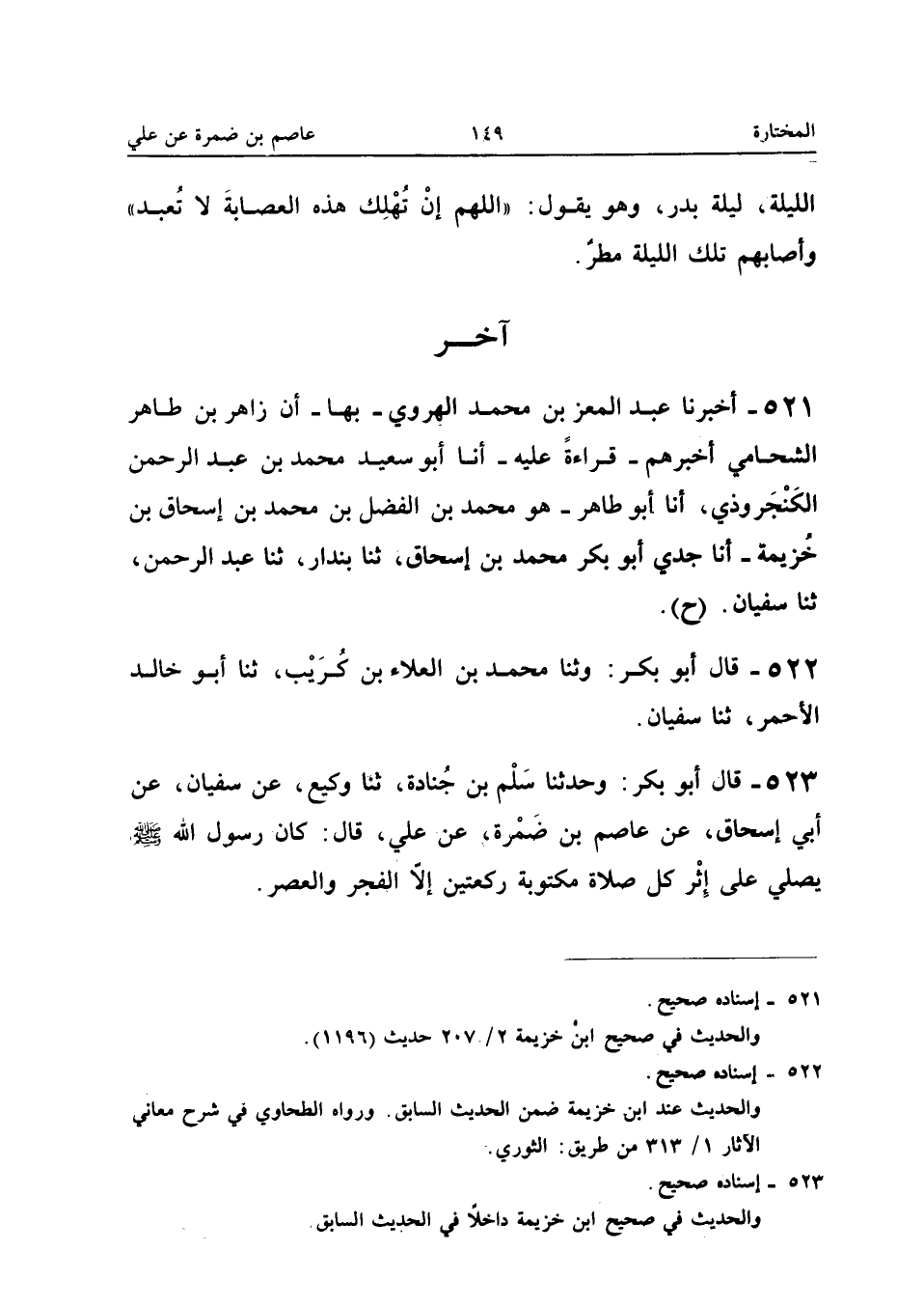521 - أخبرنَا عبد الْمعز بْنُ مُحَمَّدٍ الْهَرَوِيَّ بِهَا أَنَّ زَاهِرَ بْنَ طَاهِرٍ الشَّحَّامِيَّ أَخْبَرَهُمْ قِرَاءَةً عَلَيْهِ أَنَا أَبُو سعيد مُحَمَّد بن عبد الرَّحْمَن الْكَنْجَرُوذِيُّ أَنَا أَبُو طَاهِرٍ هُوَ مُحَمَّدُ بْنُ الْفَضْلِ بْنِ مُحَمَّدِ بْنِ إِسْحَاقَ بْنِ خُزَيْمَةَ أَنَا جَدِّي أَبُو بَكْرٍ مُحَمَّدُ بْنُ إِسْحَاقَ ثَنَا بنْدَار ثَنَا عبد الرَّحْمَن ثَنَا سُفْيَان (ح) (إِسْنَاده صَحِيح)