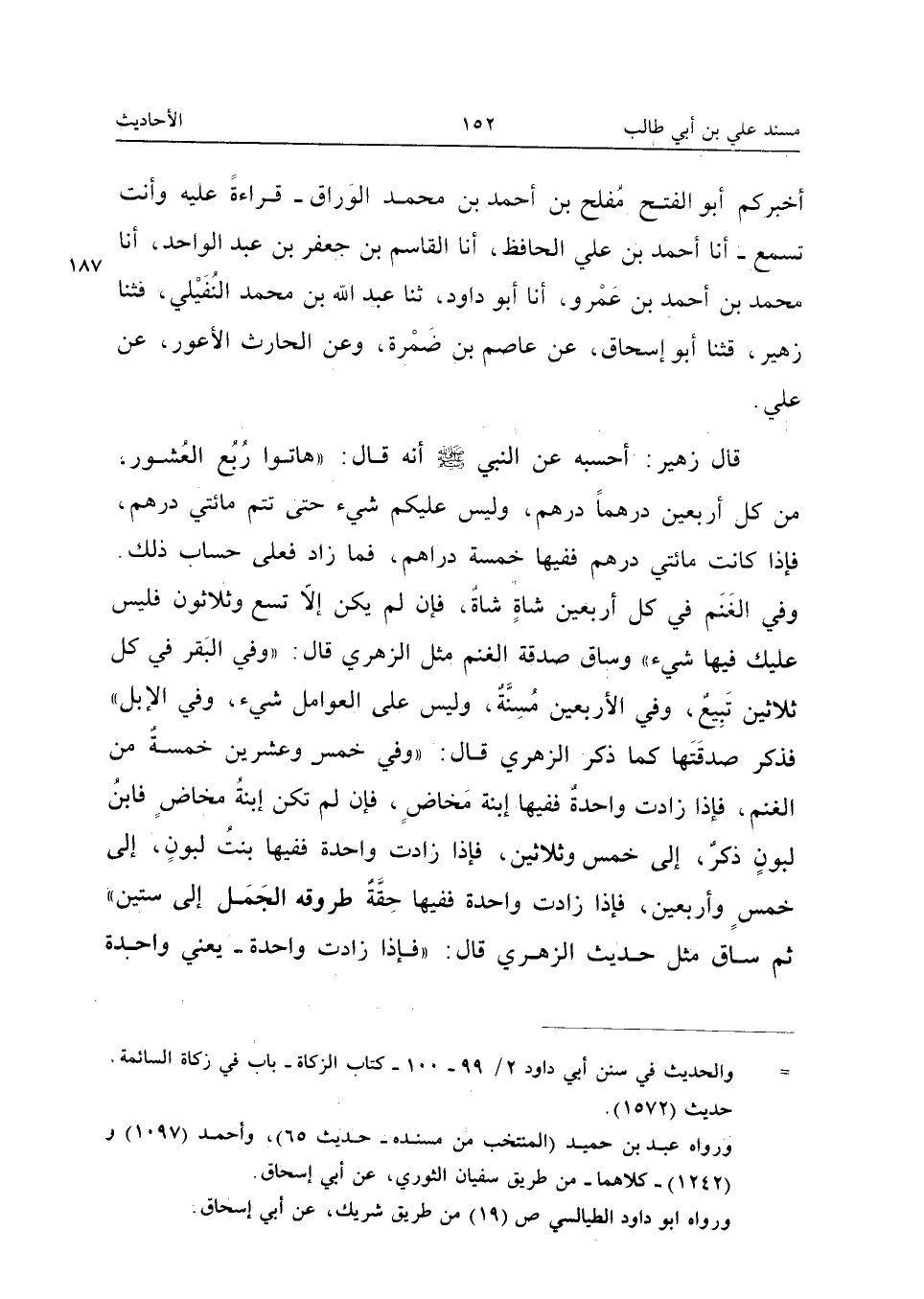 أَخْبَرَكُمْ أَبُو الْفَتْحِ مُفْلِحُ بْنُ أَحْمَدَ بْنِ مُحَمَّدٍ الْوَرَّاقُ قِرَاءَةً عَلَيْهِ وَأَنْتَ تَسْمَعُ أَنَا أَحْمَدُ بْنُ عَلِيٍّ الْحَافِظُ أَنَا الْقَاسِمُ بْنُ جَعْفَر بن عبد الْوَاحِد أَنَا مُحَمَّدُ بْنُ أَحْمَدَ بْنِ عَمْرٍو أَنَا أَبُو دَاوُد ثَنَا عبد الله بْنُ مُحَمَّدٍ النُّفَيْلِيُّ قَثَنَا زُهَيْرٌ قَثَنَا أَبُو إِسْحَاقَ عَنْ عَاصِمِ بْنِ ضَمْرَةَ وَعَنِ الْحَارِثِ الأَعْوَرِ عَنْ عَلِيٍّ قَالَ زُهَيْرٌ أَحْسِبُهُ عَنِ النَّبِيِّ صَلَّى اللَّهُ عَلَيْهِ وَسَلَّمَ أَنَّهُ قَالَ هَاتُوا رُبْعَ الْعُشُورِ مِنْ كُلِّ أَرْبَعِينَ دِرْهَمًا دِرْهَمٌ وَلَيْسَ عَلَيْكُمْ شَيْءٌ حَتَّى تَتِمَّ مِائَتَيْ دِرْهَم فَإِذا كات مِائَتَيْ دِرْهَمٍ فَفِيهَا خَمْسَةُ دَرَاهِمَ فَمَا زَادَ فَعَلَى حِسَابِ ذَلِكَ وَفِي الْغَنَمِ فِي كُلِّ أَرْبَعِينَ شَاةً شَاةٌ فَإِنْ لَمْ يَكُنْ إِلَّا تِسْعٌ وَثَلاثُونَ فَلَيْسَ عَلَيْكَ فِيهَا شَيْءٌ وَسَاقَ صَدَقَةَ الْغَنَمِ مِثْلَ الزُّهْرِيِّ قَالَ وَفِي الْبَقَرِ فِي كُلِّ ثَلاثِينَ تَبِيعٌ وَفِي الأَرْبَعِينَ مُسِنَّةٌ وَلَيْسَ عَلَى الْعَوَامِلِ شَيْءٌ وَفِي الإِبِلِ فَذَكَرَ صَدَقَتَهَا كَمَا ذَكَرَ الزُّهْرِيُّ قَالَ وَفِي خَمْسٍ وَعِشْرِينَ خَمْسَةٌ مِنَ الْغَنَمِ فَإِذَا زَادَتْ وَاحِدَةً فَفِيهَا ابْنَةُ مَخَاضٍ فَإِنْ لَمْ تَكُنِ ابْنَةُ مَخَاضٍ فَابْنُ لَبُونٍ ذَكَرٌ إِلَى خَمْسٍ وَثَلاثِينَ فَإِذَا زَادَتْ وَاحِدَةً فَفِيهَا بِنْتُ لَبُونٍ إِلَى خَمْسٍ وَأَرْبَعِينَ فَإِذَا زَادَتْ وَاحِدَةٌ فَفِيهَا حِقَّةٌ طَرُوقَةُ الْجَمَلِ إِلَى سِتِّينَ ثُمَّ سَاقَ مِثْلَ حَدِيثِ الزُّهْرِيِّ قَالَ فَإِذَا زَادَتْ وَاحِدَةً يَعْنِي وَاحِدَة