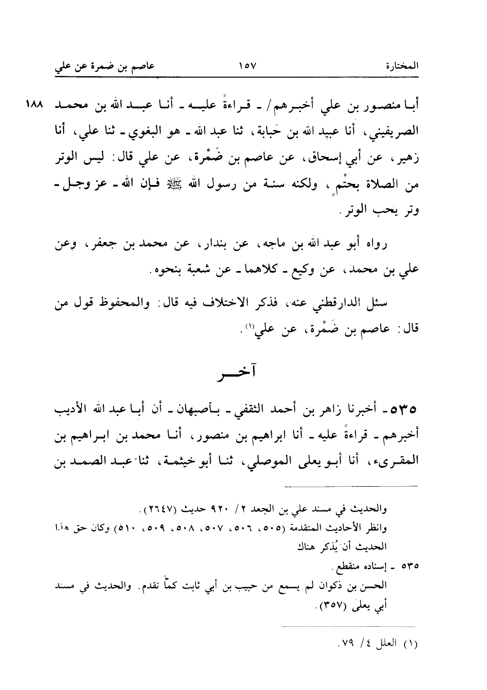 535 - أَخْبَرَنَا زَاهِرُ بْنُ أَحْمَدَ الثَّقَفِيُّ بِأَصْبَهَانَ أَن أَبَا عبد الله الأَدِيبَ أَخْبَرَهُمْ قِرَاءَةً عَلَيْهِ أَنا إِبْرَاهِيمُ بْنُ مَنْصُور أَنا مُحَمَّدُ بْنُ إِبْرَاهِيمَ بْنِ الْمُقْرِئِ أَنا أَبُو يعلى الْموصِلِي ثَنَا أَبُو خَيْثَمَة ثَنَا عبد الصَّمد بن عبد الْوَارِث قَالَ أَخْبَرَنِي أَبِي ثَنَا الْحَسَنُ بْنُ ذَكْوَانَ عَنْ حَبِيبِ بْنِ أَبِي ثَابِتٍ عَنْ عَاصِمِ بْنِ ضَمْرَةَ عَنْ عَلِيٍّ أَنَّ النَّبِيَّ صَلَّى اللَّه عَلَيْهِ وَسَلَّمَ نَهَى عَنْ كُلِّ ذِي نَابٍ مِنَ السَّبُعِ وَعَنْ كُلِّ ذِي مِخْلَبٍ مِنَ الطَّيْرِ وَعَنْ ثَمَنِ الْمَيْتَةِ وَعَنْ ثَمَنِ الْحُمُرِ الأَهْلِيَّةِ وَكَسْبِ الْبَغِيِّ وَعَنْ عَسْبِ كُلِّ ذِي فَحل (إِسْنَاده مُنْقَطع)