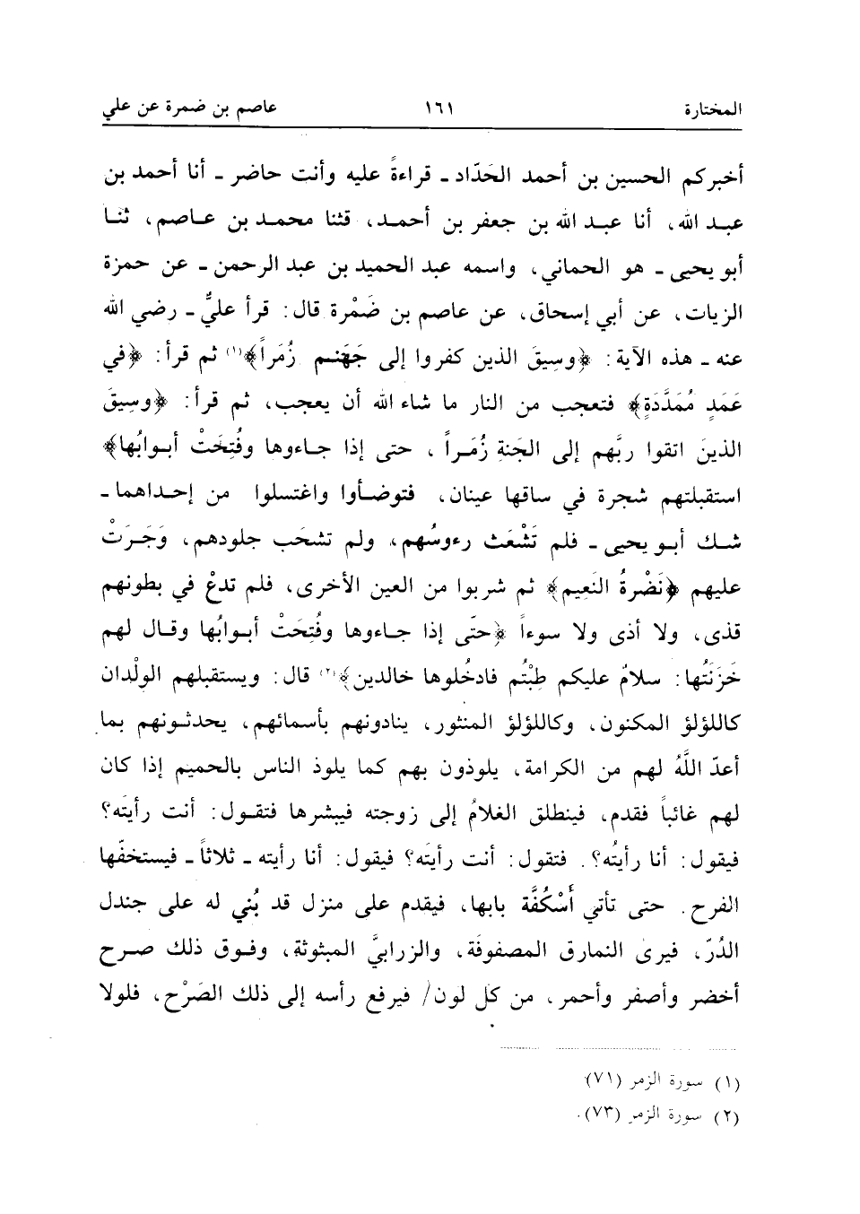 أَخْبَرَكُمُ الْحُسَيْنُ بْنُ أَحْمَدَ الْحَدَّادُ قِرَاءَةً عَلَيْهِ وَأَنت حَاضر أَنا أَحْمد بن عبد الله أَنا عبد الله بْنُ جَعْفَرِ بْنِ أَحْمَدَ قَثَنَا مُحَمَّدُ بْنُ عَاصِمٍ ثَنَا أَبُو يَحْيَى هُوَ الْحِمَّانِيُّ وَاسْمُهُ عبد الحميد بن عبد الرَّحْمَن عَنْ حَمْزَةَ الزَّيَّاتِ عَنْ أَبِي إِسْحَاقَ عَنْ عَاصِمِ بْنِ ضَمْرَةَ قَالَ قَرَأَ عَلِيٌّ رَضِيَ اللَّهُ عَنْهُ هَذِهِ الآيَةَ {وَسِيقَ الَّذِينَ كَفَرُوا إِلَى جَهَنَّم زمرا} ثمَّ قَرَأَ {فِي عمد ممددة} فَتَعَجَّبَ مِنَ النَّارَ مَا شَاءَ اللَّهُ أَنْ يَعْجَبَ ثُمَّ قَرَأَ {وَسِيقَ الَّذِينَ اتَّقَوْا رَبَّهُمْ إِلَى الْجنَّة زمرا حَتَّى إِذا جاؤوها وَفتحت أَبْوَابهَا} استقبلتهم شَجَرَة فِي سَاقهَا عينان فتوضأوا وَاغْتَسَلُوا مِنْ إِحْدَاهُمَا شَكَّ أَبُو يَحْيَى فَلَمْ تَشْعَثْ رُءُوسُهُمْ وَلَمْ تَشْحَبْ جُلُودُهُمْ وَجَرَتْ عَلَيْهِمْ {نَضرة النَّعيم} ثُمَّ شَرِبُوا مِنَ الْعَيْنِ الأُخْرَى فَلَمْ تَدَعْ فِي بُطُونِهِمْ قَذًى وَلا أَذًى وَلا سُوءًا {حَتَّى إِذا جاؤوها وَفُتِحَتْ أَبْوَابُهَا وَقَالَ لَهُمْ خَزَنَتُهَا سَلامٌ عَلَيْكُمْ طبتم فادخلوها خَالِدين} قَالَ وَيَسْتَقْبِلُهُمْ الْوِلْدَانُ كَاللُّؤْلُؤِ الْمَكْنُونِ وَكَاللُّؤْلُؤِ الْمَنْثُورِ يُنَادُونَهُمْ بِأَسْمَائِهِمْ يُحَدِّثُونَهُمْ بِمَا أَعَدَّ اللَّهُ لَهُمْ مِنَ الْكَرَامَةِ يَلُوذُونَ بِهِمْ كَمَا يَلُوذُ النَّاسُ بِالْحَمِيمِ إِذَا كَانَ لَهُمْ غَائِبًا فَقَدِمَ فَيَنْطَلِقُ الْغُلامُ إِلَى زَوْجَتِهِ فَيُبَشِّرُهَا فَتَقُولُ أَنْتَ رَأَيْتَهُ فَيَقُولُ أَنَا رَأَيْتُهُ فَتَقُولُ أَنْتَ رَأَيْتَهُ فَيَقُولُ أَنَا رَأَيْتُهُ ثَلاثًا فَيَسْتَخِفُّهَا الْفَرَحُ حَتَّى تَأْتِيَ أُسْكُفَّةَ بَابِهَا فَيَقْدَمُ عَلَى مَنْزِلٍ قَدْ بُنِيَ لَهُ عَلَى جَنْدَلِ الدُّرِّ فَيَرَى النَّمَارِقَ الْمَصْفُوفَةَ وَالزَّرَابِيَّ الْمَبْثُوثَةُ وَفَوْقَ ذَلِكَ صَرْحٌ أَخْضَرُ وَأَصْفَرُ وَأَحْمَرُ مِنْ كُلِّ لَوْنٍ فَيَرْفَعُ رَأْسَهُ إِلَى ذَلِكَ الصَّرْحِ فَلَوْلَا