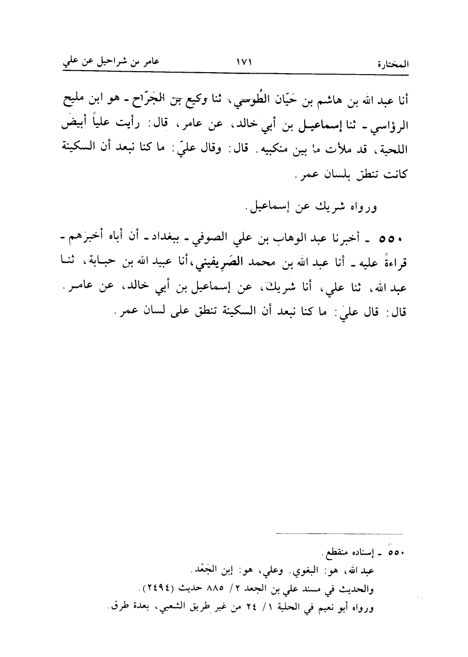 550 - أخبرنَا عبد الْوَهَّاب بْنُ عَلِيٍّ الصُّوفِيُّ بِبَغْدَادَ أَنَّ أَبَاهُ أَخْبَرَهُمْ قِرَاءَة عَلَيْهِ أَنا عبد الله بن مُحَمَّد الصريفيني أَنا عبيد الله بن حبابة ثَنَا عبد الله ثَنَا عَلِيٌّ أَنَا شَرِيكٌ عَنْ إِسْمَاعِيلَ بْنِ أَبِي خَالِدٍ عَنْ عَامِرٍ قَالَ قَالَ عَلِيٌّ مَا كُنَّا نَبْعُدُ أَنَّ السَّكِينَةَ تَنْطِقُ عَلَى لِسَان عمر (إِسْنَاده مُنْقَطع)