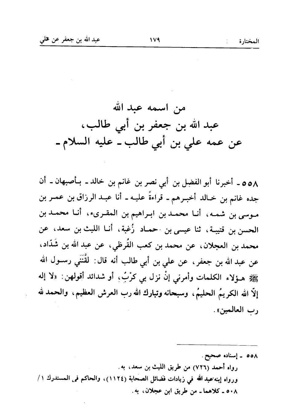 558 - أَخْبَرَنَا أَبُو الْفَضْلِ بْنُ أَبِي نَصْرِ بْنِ غَانِمِ بْنِ خَالِدٍ بِأَصْبَهَانَ أَنَّ جَدَّهُ غَانِمَ بْنَ خَالِد أخْبرهُم قِرَاءَة عَلَيْهِ أَنا عبد الرَّزَّاق بْنُ عُمَرَ بْنِ مُوسَى بْنِ شَمَّةَ أَنا مُحَمَّد بن إِبْرَاهِيم بن الْمُقْرِئِ أَنَا مُحَمَّدُ بْنُ الْحَسَنِ بْنِ قُتَيْبَةَ ثَنَا عِيسَى بْنُ حَمَّادٍ زُغْبَةَ أَنَا اللَّيْثُ بْنُ سَعْدٍ عَنْ مُحَمَّدِ بْنِ الْعَجْلانِ عَنْ مُحَمَّد بن كَعْب الْقرظِيّ عَن عبد الله بن شَدَّاد عَن عبد الله بْنِ جَعْفَرٍ عَنْ عَلِيِّ بْنِ أَبِي طَالِبٍ أَنَّهُ قَالَ لَقَّنَنِي رَسُولُ اللَّهِ صَلَّى اللَّه عَلَيْهِ وَسَلَّمَ هَؤُلاءِ الْكَلِمَاتِ وَأَمَرَنِي إِنْ نَزَلَ بِي كَرْبٌ أَوْ شَدَائِدُ أَقُولُهُنَّ لَا إِلَهَ إِلَّا اللَّهُ الْكَرِيمُ الْحَلِيمُ وَسُبْحَانَهُ وَتَبَارَكَ اللَّهُ رَبُّ الْعَرْشِ الْعَظِيمِ وَالْحَمْدُ لِلَّهِ رَبِّ الْعَالَمِينَ (إِسْنَاده صَحِيح)