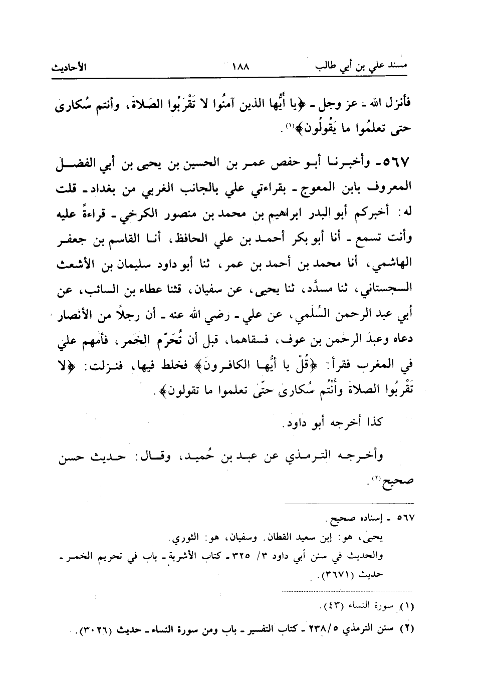 567 - وأَخْبَرَنَا أَبُو حَفْصٍ عُمَرُ بْنُ الْحُسَيْنِ بْنِ يَحْيَى بْنِ أَبِي الْفَضْلِ الْمَعْرُوفُ بِابْنِ الْمُعوجِ بِقِرَاءَتِي عَليّ بِالْجَانِبِ الْغَرْبِيِّ مِنْ بَغْدَادَ قُلْتُ لَهُ أَخْبَرَكُمْ أَبُو الْبَدْرِ إِبْرَاهِيمُ بْنُ مُحَمَّدِ بْنِ مَنْصُورٍ الْكَرْخِيُّ قِرَاءَةً عَلَيْهِ وَأَنْتَ تَسْمَعُ أَنَا أَبُو بَكْرٍ أَحْمَدُ بْنُ عَلِيٍّ الْحَافِظُ أَنَا الْقَاسِمُ بْنُ جَعْفَرٍ الْهَاشِمِيُّ أَنَا مُحَمَّدُ بْنُ أَحْمَدَ بْنِ عُمَرَ ثَنَا أَبُو دَاوُدَ سُلَيْمَانُ بْنُ الأَشْعَثِ السِّجِسْتَانِيُّ ثَنَا مُسَدَّدٌ ثَنَا يَحْيَى عَنْ سُفْيَانَ قثنا عَطَاءُ بْنُ السَّائِبِ عَنْ أَبِي عبد الرَّحْمَن السُّلَمِيِّ عَنْ عَلِيٍّ رَضِيَ اللَّهُ عَنْهُ أَنَّ رجلا من الْأَنْصَار دَعَاهُ وَعبد الرَّحْمَن بْنَ عَوْفٍ فَسَقَاهُمَا قَبْلَ أَنْ تُحَرَّمَ الْخَمْرُ فَأمهمْ عَليّ فِي الْمغرب فَقَرَأَ {قل يَا أَيهَا الْكَافِرُونَ} فَخَلَطَ فِيهَا فَنَزَلَتْ {لَا تَقْرَبُوا الصَّلاةَ وَأَنْتُم سكارى حَتَّى تعلمُوا مَا تَقولُونَ}
