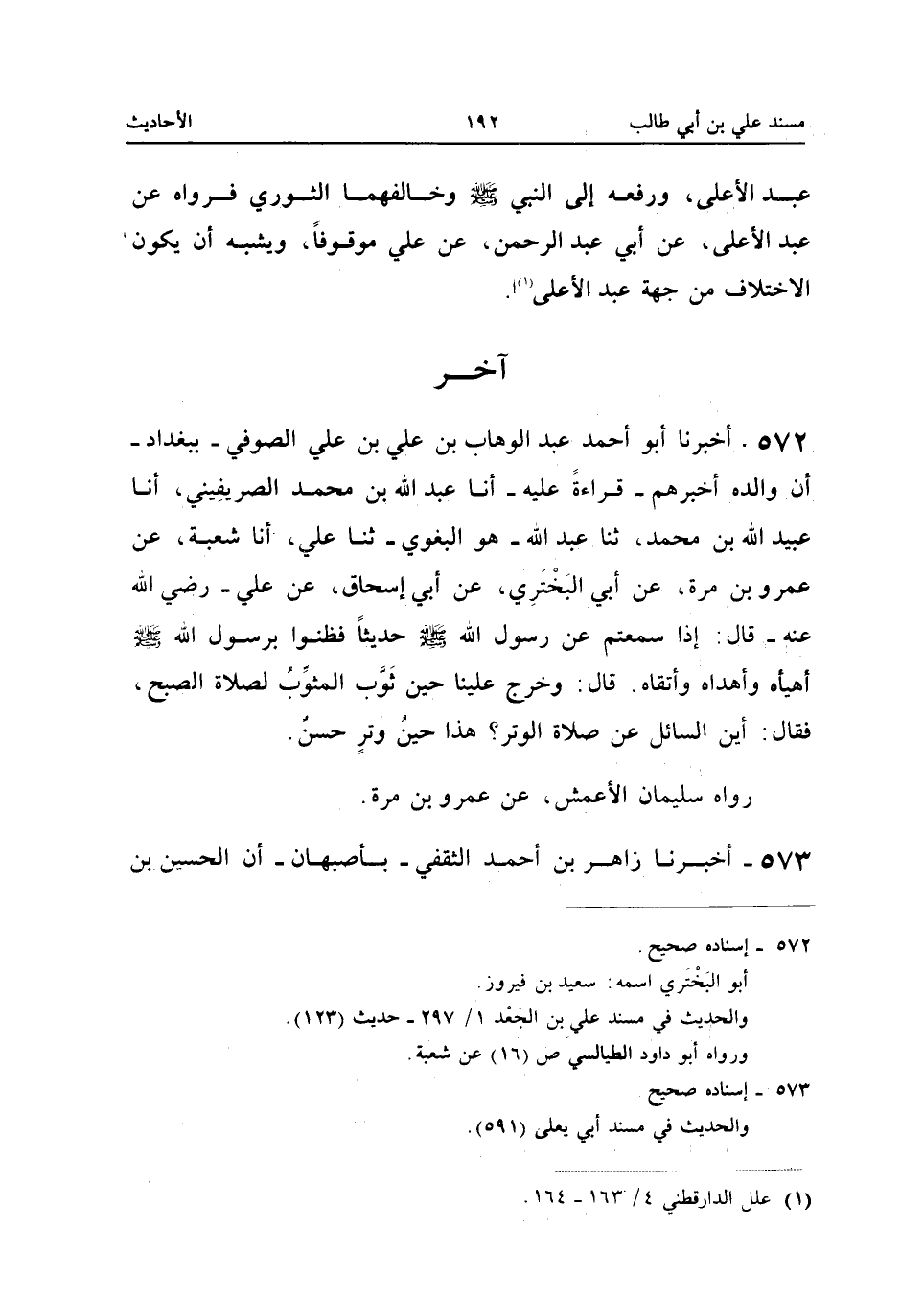 572 - أخبرنَا أَبُو أَحْمد عبد الْوَهَّاب بْنُ عَلِيِّ بْنِ عَلِيٍّ الصُّوفِيُّ بِبَغْدَادَ أَنَّ وَالِده أخْبرهُم قِرَاءَة عَلَيْهِ أَنا عبد الله بن مُحَمَّد الصريفيني أَنا عبيد الله بن مُحَمَّد ثَنَا عبد الله هُوَ الْبَغَوِيُّ ثَنَا عَلِيٌّ أَنَا شُعْبَةُ عَنْ عَمْرِو بْنِ مُرَّةَ عَنْ أَبِي الْبَخْتَرِيِّ عَنْ أَبِي إِسْحَاقَ عَنْ عَلِيٍّ رَضِيَ اللَّهُ عَنْهُ قَالَ إِذَا سَمِعْتُمْ عَنْ رَسُولِ اللَّهِ صَلَّى اللَّه عَلَيْهِ وَسَلَّمَ حَدِيثًا فَظُنُّوا بِرَسُولِ اللَّهِ صَلَّى اللَّه عَلَيْهِ وَسَلَّمَ أَهْيَأَهُ وَأَهْدَاهُ وَأَتْقَاهُ قَالَ وَخَرَجَ عَلَيْنَا حِينَ ثَوَّبَ الْمُثَوِّبُ لِصَلاةِ الصُّبْحِ فَقَالَ أَيْنَ السَّائِلُ عَنْ صَلاةِ الْوِتْرِ هَذَا حِينُ وِتْرٍ حَسَنٌ