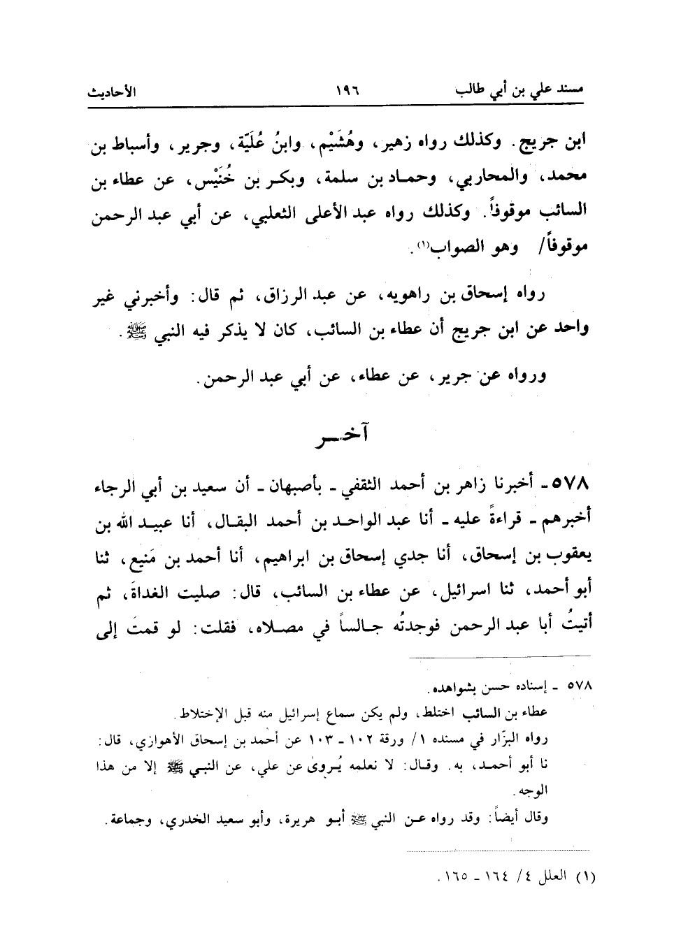 ابْنِ جُرَيْحٍ وَكَذَلِك رَوَاهُ زُهَيْرٌ وَهُشَيْمٌ وَابْنُ عُلَيَّةَ وَجَرِيرٌ وَأَسْبَاطُ بْنُ مُحَمَّدٍ وَالْمُحَارِبِيُّ وَحَمَّادُ بْنُ سَلَمَةَ وَبَكْرُ بْنُ خُنَيْسٍ عَنْ عَطَاءِ بن السَّائِب مَوْقُوفا وَكَذَلِكَ رَوَاهُ عبد الْأَعْلَى الثَّعْلَبِيّ عَن أبي عبد الرَّحْمَن مَوْقُوفًا وَهُوَ الصَّوَابُ رَوَاهُ إِسْحَاقُ بْنُ رَاهُوَيْهِ عَن عبد الرَّزَّاق ثُمَّ قَالَ وَأَخْبَرَنِي غَيْرُ وَاحِدٍ عَنِ ابْنِ جُرَيْجٍ أَنَّ عَطَاءَ بْنَ السَّائِبِ كَانَ لَا يَذْكُرُ فِيهِ النَّبِيَّ صَلَّى اللَّه عَلَيْهِ وَسَلَّمَ وَرَوَاهُ عَنْ جَرِيرٍ عَنْ عَطَاءٍ عَنْ أَبِي عبد الرَّحْمَن (رِجَاله ثِقَات وَالصَّوَاب وَقفه)