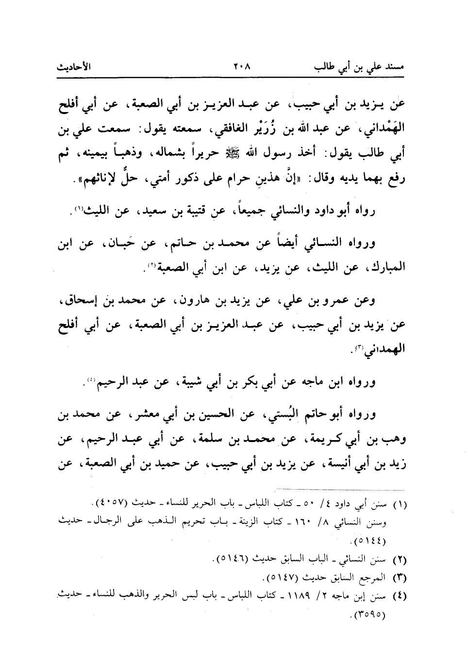 عَن يزِيد بن أبي حبيب عَن عبد الْعَزِيز بْنِ أَبِي الصَّعْبَةِ عَنْ أَبِي أَفْلَحَ الْهَمْدَانِيِّ عَن عبد الله بْنِ زُرَيْرٍ الْغَافِقِيِّ سَمِعْتُهُ يَقُولُ سَمِعْتُ عَلِيَّ بْنَ أَبِي طَالِبٍ يَقُولُ أَخَذَ رَسُولُ اللَّهِ صَلَّى اللَّه عَلَيْهِ وَسَلَّمَ حَرِيرًا بِشِمَالِهِ وَذَهَبًا بِيَمِينِهِ ثُمَّ رَفَعَ بِهِمَا يَدَيْهِ وَقَالَ إِنَّ هَذَيْنِ حَرَامٌ عَلَى ذُكُورِ أُمَّتِي حِلٌّ لإِنَاثِهِمْ