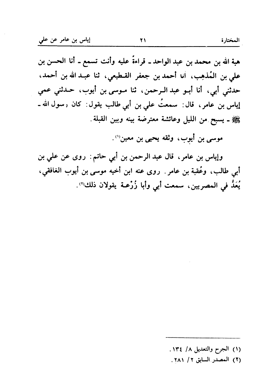 هبة الله بن مُحَمَّد بن عبد الْوَاحِد قِرَاءَةً عَلَيْهِ وَأَنْتَ تَسْمَعُ أَنا الْحَسَنُ بْنُ عَلِيِّ بْنِ الْمُذْهِبِ أَنا أَحْمَدُ بْنُ جَعْفَرٍ الْقطيعِي ثَنَا عبد الله بن أَحْمد حَدثنِي أبي أَنا أَبُو عبد الرَّحْمَن ثَنَا مُوسَى بْنُ أَيُّوبَ حَدَّثَنِي عَمِّي إِيَاسُ بْنُ عَامِرٍ قَالَ سَمِعْتُ عَلِيَّ بْنَ أَبِي طَالِبٍ يَقُولُ كَانَ رَسُولُ اللَّهِ صَلَّى اللَّه عَلَيْهِ وَسَلَّمَ يُسَبِّحُ مِنَ اللَّيْلِ وَعَائِشَةُ مُعْتَرِضَةٌ بَيْنَهُ وَبَيْنَ الْقِبْلَةِ