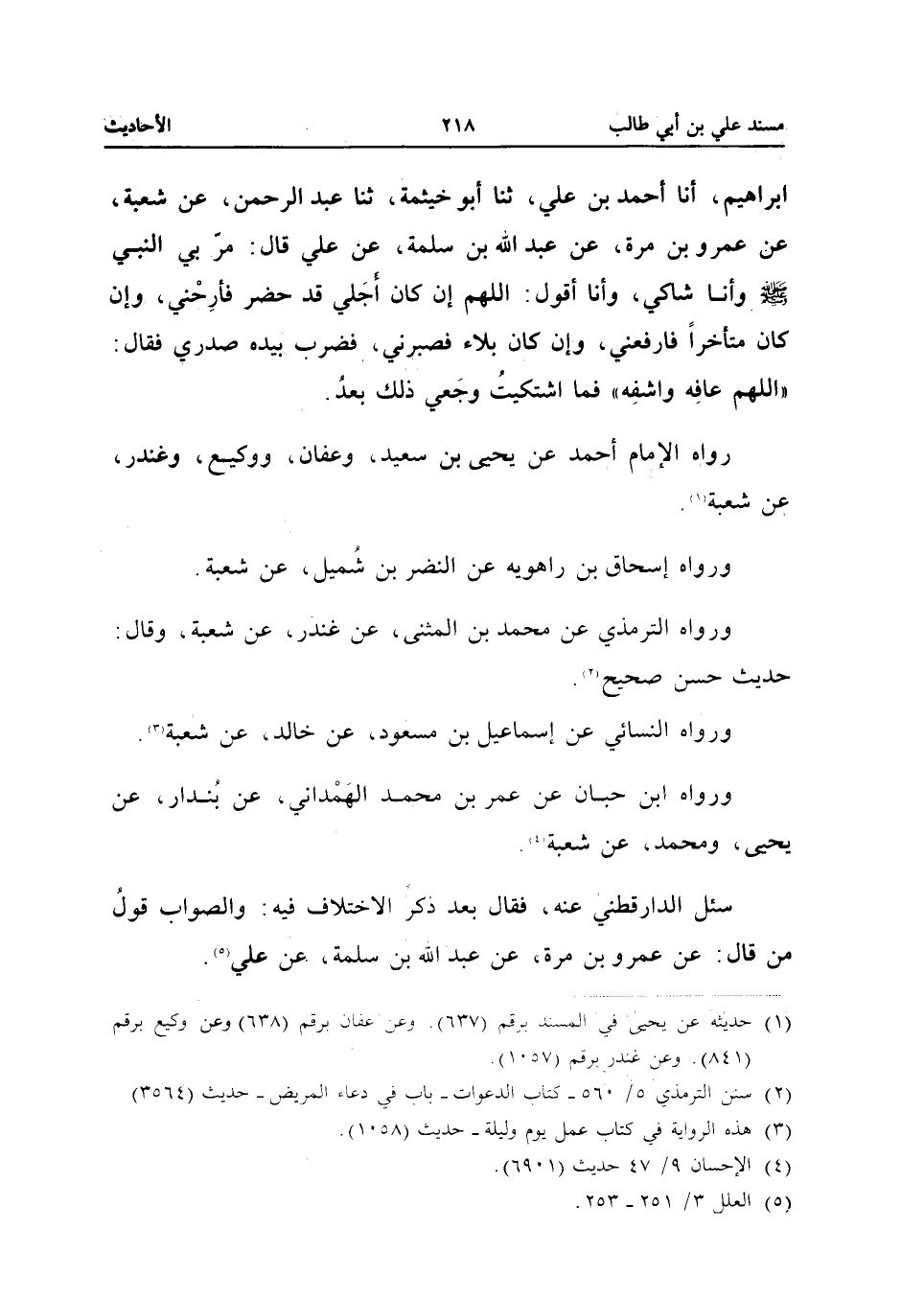 رَوَاهُ الإِمَامُ أَحْمَدُ عَنْ يَحْيَى بْنِ سَعِيدٍ وَعَفَّانَ وَوَكِيعٍ وَغُنْدَرٍ عَنْ شُعْبَةَ وَرَوَاهُ إِسْحَاقُ بْنُ رَاهُوَيْهِ عَنِ النَّضْرِ بْنِ شُمَيْلٍ عَنْ شُعْبَةَ وَرَوَاهُ التِّرْمِذِيُّ عَنْ مُحَمَّدِ بْنِ الْمُثَنَّى عَنْ غُنْدَرٍ عَنْ شُعْبَةَ وَقَالَ حَدِيثٌ حَسَنٌ صَحِيحٌ وَرَوَاهُ النَّسَائِيُّ عَنْ إِسْمَاعِيلَ بْنِ مَسْعُودٍ عَنْ خَالِدٍ عَنْ شُعْبَةَ وَرَوَاهُ ابْنُ حِبَّانَ عَنْ عُمَرَ بْنِ مُحَمَّدٍ الْهَمْدَانِيِّ عَنْ بُنْدَارٍ عَنْ يَحْيَى وَمُحَمَّدٍ عَنْ شُعْبَةَ سُئِلَ الدَّارَقُطْنِيُّ عَنْهُ فَقَالَ بَعْدَ ذِكْرِ الاخْتِلافِ فِيهِ وَالصَّوَابُ قَوْلُ مَنْ قَالَ عَنْ عَمْرِو بْنِ مرّة عَن عبد الله بن سَلمَة عَن عَليّ (إِسْنَاده صَحِيح)