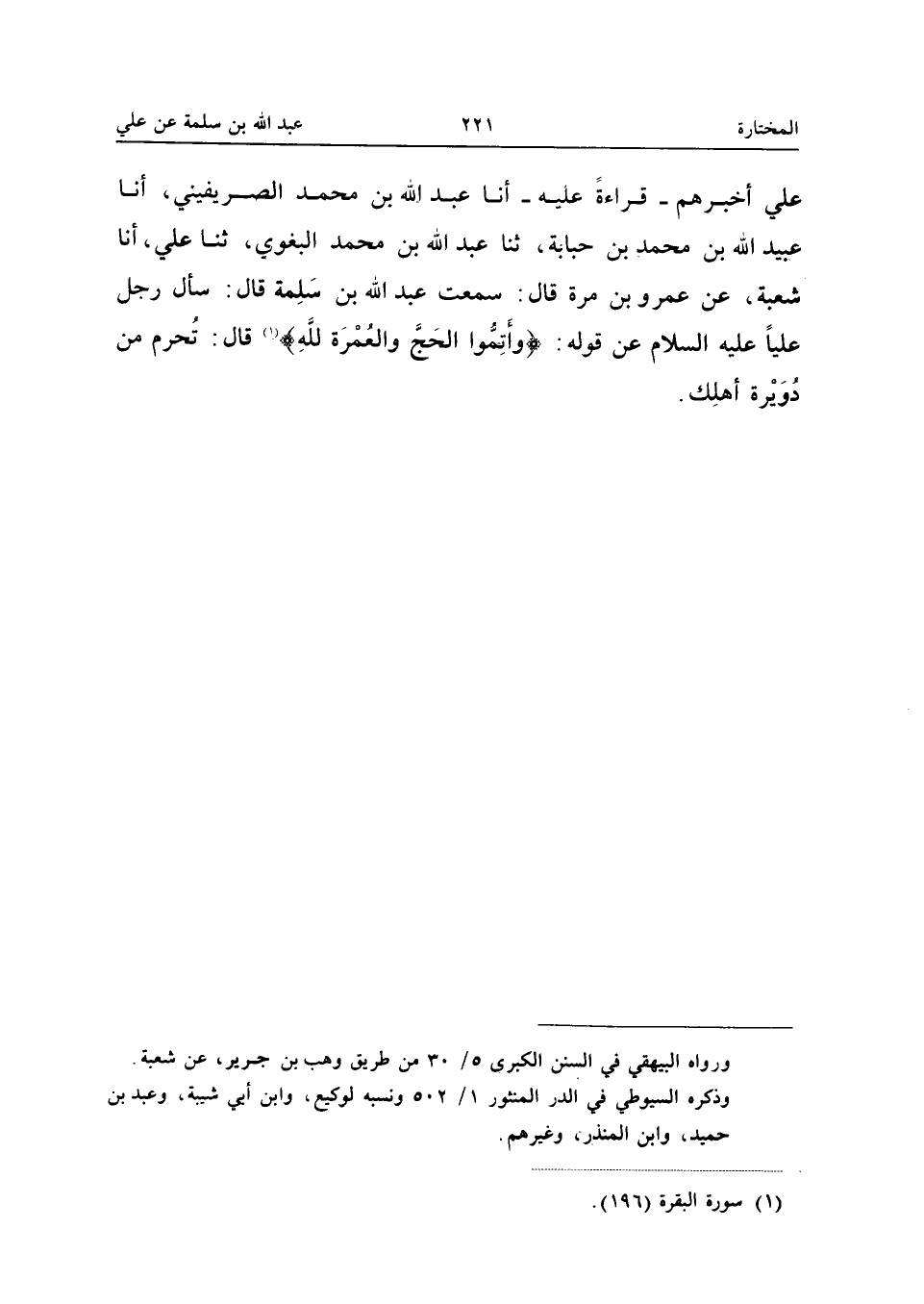 عَليّ أخْبرهُم قِرَاءَة عَلَيْهِ أَنا عبد الله بن مُحَمَّد الصريفيني أَنا عبيد الله بن مُحَمَّد بن حبابة ثَنَا عبد الله بْنُ مُحَمَّدٍ الْبَغَوِيُّ ثَنَا عَلِيٌّ أَنَا شُعْبَةُ عَن عَمْرو بن مرّة قَالَ سَمِعت عبد الله بْنَ سَلَمَةَ قَالَ سَأَلَ رَجُلٌ عَلِيًّا عَلَيْهِ السَّلامُ عَنْ قَوْلِهِ {وَأَتِمُّوا الْحَجَّ وَالْعُمْرَةَ لِلَّهِ} قَالَ تحرم من دويرة أهلك (إِسْنَاده صَحِيح)