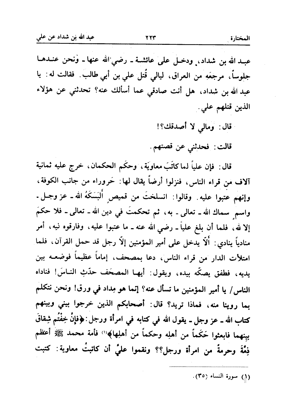 عبد الله بْنُ شَدَّادٍ وَدَخَلَ عَلَى عَائِشَةَ رَضِيَ اللَّهُ عَنْهَا وَنَحْنُ عِنْدَهَا جُلُوسًا مَرْجِعَهُ مِنَ الْعِرَاقِ لَيَالِي قُتِلَ عَلِيُّ بْنُ أَبِي طَالِبٍ فَقَالَتْ لَهُ يَا عبد الله بْنَ شَدَّادٍ هَلْ أَنْتَ صَادِقِي عَمَّا أَسْأَلُكَ عَنْهُ تُحَدِّثُنِي عَنْ هَؤُلاءِ الَّذِينَ قَتَلَهُمْ عَلِيٌّ قَالَ وَمَالِي لَا أَصْدُقُكِ قَالَتْ فَحَدِّثْنِي عَنْ قِصَّتِهِمْ قَالَ فَإِنَّ عَلِيًّا لَمَّا كَاتَبَ مُعَاوِيَةَ وَحَكَمَ الْحَكَمَانِ خَرَجَ عَلَيْهِ ثَمَانِيَةَ آلافٍ مِنْ قُرَّاءِ النَّاسِ فَنَزَلُوا أَرْضًا يُقَالُ لَهَا حَرُورَاءُ مِنْ جَانِبِ الْكُوفَةِ وَإِنَّهُمْ عَتَبُوا عَلَيْهِ وَقَالُوا انْسَلَخْتَ مِنْ قَمِيصٍ أَلْبَسَكَهُ اللَّهُ عَزَّ وَجَلَّ وَاسْمٍ سَمَّاكَ اللَّهُ تَعَالَى بِهِ ثُمَّ تَحَكَّمْتَ فِي دِينِ اللَّهِ تَعَالَى فَلا حُكْمَ إِلَّا لِلَّهِ فَلَمَّا أَنْ بَلَغَ عَلِيًّا رَضِيَ اللَّهُ عَنْهُ مَا عَتَبُوا عَلَيْهِ وَفَارَقُوهُ فِيهِ أَمَرَ مُنَادِيًا يُنَادِي أَلَّا يَدْخُلَ عَلَى أَمِيرِ الْمُؤْمِنِينَ إِلَّا رَجُلٌ قَدْ حَمَلَ الْقُرْآنَ فَلَمَّا امْتَلَأَتِ الدَّارُ مِنْ قُرَّاءِ النَّاسِ دَعَا بِمُصْحَفٍ إِمَامًا عَظِيمًا فَوَضَعَهُ بَيْنَ يَدَيْهِ فَطَفِقَ يَصُكُّهُ بِيَدِهِ وَيَقُولُ أَيُّهَا الْمُصْحَفُ حَدِّثِ النَّاسَ فَنَادَاهُ النَّاسُ يَا أَمِيرَ الْمُؤْمِنِينَ مَا تَسْأَلُ عَنْهُ إِنَّمَا هُوَ مِدَادٌ فِي وَرَقٍ وَنَحْنُ نَتَكَلَّمُ بِمَا رَوَيْنَا مِنْهُ فَمَاذَا تُرِيدُ قَالَ أَصْحَابُكُمْ الَّذِينَ خَرَجُوا بَيْنِي وَبَيْنَهُمْ كِتَابُ اللَّهِ عَزَّ وَجَلَّ يَقُولُ اللَّهُ فِي كِتَابِهِ فِي امْرَأَةٍ وَرَجُلٍ {وَإِنْ خِفْتُمْ شِقَاقَ بَيْنِهِمَا فَابْعَثُوا حَكَمًا مِنْ أَهله وَحكما من أَهلهَا} فَأُمَّةُ مُحَمَّدٍ صَلَّى اللَّه عَلَيْهِ وَسَلَّمَ أَعْظَمُ ذِمَّةً وَحُرْمَةً مِنَ امْرَأَةٍ وَرَجُلٍ وَنَقِمُوا عَلَيَّ أَنْ كَاتَبْتَ مُعَاوِيَةَ كَتَبْتُ
