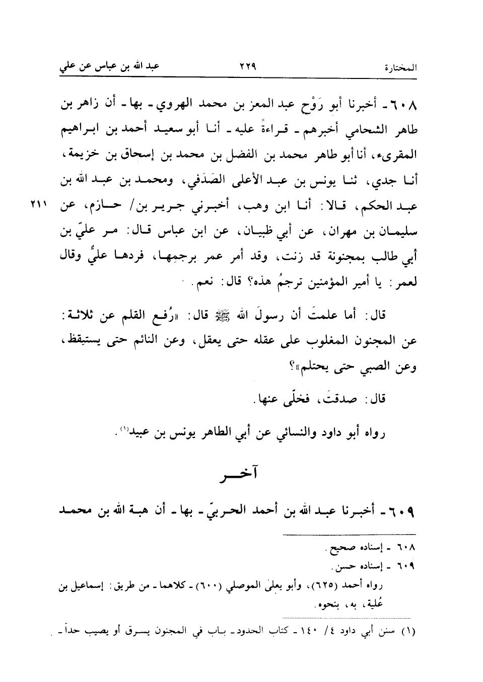 608 - أخبرنَا أَبُو روح عبد الْمعز بْنُ مُحَمَّدٍ الْهَرَوِيَّ بِهَا أَنَّ زَاهِرَ بْنَ طَاهِرٍ الشَّحَّامِيَّ أَخْبَرَهُمْ قِرَاءَةً عَلَيْهِ أَنَا أَبُو سَعِيدٍ أَحْمَدُ بْنُ إِبْرَاهِيمَ الْمُقْرِئُ أَنَا أَبُو طَاهِرٍ مُحَمَّدُ بْنُ الْفَضْلِ بْنِ مُحَمَّدِ بْنِ إِسْحَاقَ بْنِ خُزَيْمَةَ أَنَا جَدِّي ثَنَا يُونُسُ بن عبد الْأَعْلَى الصَّدَفِي وَمُحَمّد بن عبد الله بن عبد الحكم قَالا أَنَا ابْنُ وَهْبٍ أَخْبَرَنِي جَرِيرُ بْنُ حَازِمٍ عَنْ سُلَيْمَانَ بْنِ مِهْرَانَ عَنْ أَبِي ظَبْيَانَ عَنِ ابْنِ عَبَّاسٍ قَالَ مَرَّ عَلِيُّ بْنُ أَبِي طَالِبٍ بِمَجْنُونَةٍ قَدْ زَنَتْ وَقَدْ أَمَرَ عُمَرُ بِرَجْمِهَا فَرَدَّهَا عَلِيٌّ وَقَالَ لِعُمَرَ يَا أَمِيرَ الْمُؤْمِنِينَ تَرْجُمُ هَذِهِ قَالَ نَعَمْ قَالَ أَمَا عَلِمْتَ أَنَّ رَسُولَ اللَّهِ صَلَّى اللَّه عَلَيْهِ وَسَلَّمَ قَالَ رُفِعَ الْقَلَمُ عَنْ ثَلاثَةٍ عَنِ الْمَجْنُونِ الْمَغْلُوبِ عَلَى عَقْلِهِ حَتَّى يَعْقِلَ وَعَنِ النَّائِمِ حَتَّى يَسْتَيْقِظَ وَعَنِ الصَّبِيِّ حَتَّى يَحْتَلِمَ قَالَ صَدَقْتَ فَخَلَّى عَنْهَا