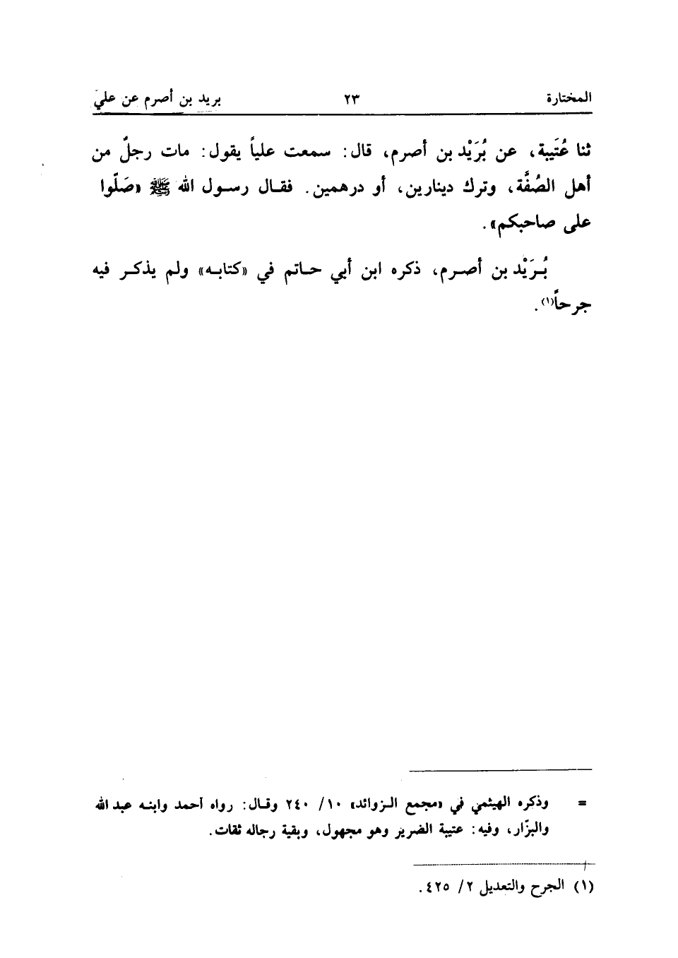 ثَنَا عُتَيْبَةُ عَنْ بُرَيْدِ بْنِ أَصْرَمَ قَالَ سَمِعْتُ عَلِيًّا يَقُولُ مَاتَ رَجُلٌ مِنْ أَهْلِ الصُّفَّةِ وَتَرَكَ دِينَارَيْنِ أَوْ دِرْهَمَيْنِ فَقَالَ رَسُولُ اللَّهِ صَلَّى اللَّه عَلَيْهِ وَسَلَّمَ صَلُّوا عَلَى صَاحِبِكُمْ