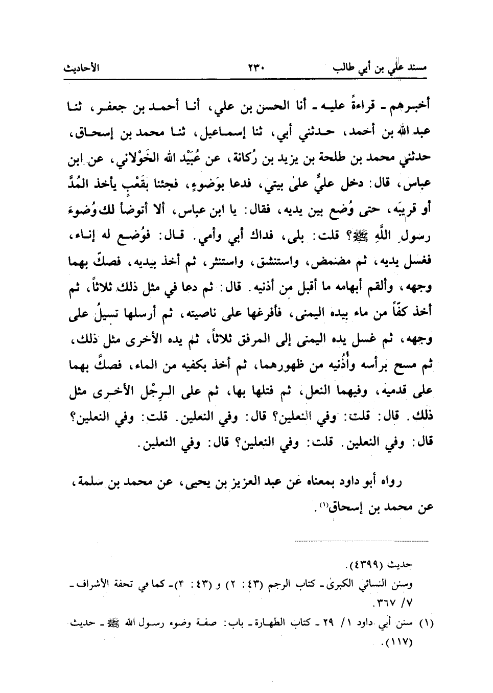 أَخْبَرَهُمْ قِرَاءَةً عَلَيْهِ أَنا الْحَسَنُ بْنُ عَلِيٍّ أَنا أَحْمد بن جَعْفَر ثَنَا عبد الله بْنُ أَحْمَدَ حَدَّثَنِي أَبِي ثَنَا إِسْمَاعِيلُ ثَنَا مُحَمَّدُ بْنُ إِسْحَاقَ حَدَّثَنِي مُحَمَّدُ بْنُ طَلْحَةَ بن يزِيد بن ركَانَة عَن عبيد الله الْخَوْلانِيِّ عَنِ ابْنِ عَبَّاسٍ قَالَ دَخَلَ عَلِيٌّ عَلَى بَيْتِي فَدَعَا بِوَضُوءٍ فَجِئْنَا بِقَعْبٍ يَأْخُذُ الْمُدَّ أَوْ قَرِيبَهُ حَتَّى وُضِعَ بَيْنَ يَدَيْهِ فَقَالَ يَا ابْن عَبَّاسٍ أَلَا أَتَوَضَّأُ لَكَ وُضُوءَ رَسُولِ اللَّهِ صَلَّى اللَّه عَلَيْهِ وَسَلَّمَ قُلْتُ بَلَى فِدَاكَ أَبِي وَأُمِّي قَالَ فَوُضِعَ لَهُ إِنَاءٌ فَغَسَلَ يَدَيْهِ ثُمَّ مَضْمَضَ وَاسْتَنْشَقَ وَاسْتَنْثَرَ ثُمَّ أَخَذَ بِيَدَيْهِ فَصَكَّ بِهِمَا وَجْهَهُ وَأَلْقَمَ إِبْهَامَهُ مَا أَقْبَلَ مِنْ أُذُنَيْهِ قَالَ ثُمَّ دَعَا فِي مِثْلِ ذَلِكَ ثَلاثًا ثُمَّ أَخَذَ كَفًّا مِنْ مَاءٍ بِيَدِهِ الْيُمْنَى فَأَفْرَغَهَا عَلَى نَاصِيَتِهِ ثُمَّ أَرْسَلَهَا تَسِيلُ عَلَى وَجْهِهِ ثُمَّ غَسَلَ يَدَهُ الْيُمْنَى إِلَى الْمِرْفَقِ ثَلاثًا ثُمَّ يَدَهُ الأُخْرَى مِثْلَ ذَلِكَ ثُمَّ مَسَحَ بِرَأْسِهِ وَأُذُنَيْهِ مِنْ ظُهُورِهِمَا ثُمَّ أَخَذَ بِكَفَّيْهِ مِنَ الْمَاءِ فَصَكَّ بِهِمَا عَلَى قَدَمَيْهِ وَفِيهِمَا النَّعْلُ ثُمَّ فَتَلَهَا بِهَا ثُمَّ عَلَى الرِّجْلِ الأُخْرَى مِثْلَ ذَلِكَ قَالَ قُلْتُ وَفِي النَّعْلَيْنِ قَالَ وَفِي النَّعْلَيْنِ قُلْتُ وَفِي النَّعْلَيْنِ قَالَ وَفِي النَّعْلَيْنِ قُلْتُ وَفِي النَّعْلَيْنِ قَالَ وَفِي النَّعْلَيْنِ رَوَاهُ أَبُو دَاوُد بِمَعْنَاهُ عَن عبد الْعَزِيز بْنِ يَحْيَى عَنْ مُحَمَّدِ بْنِ سَلَمَةَ عَنْ مُحَمَّدِ بْنِ إِسْحَاقَ