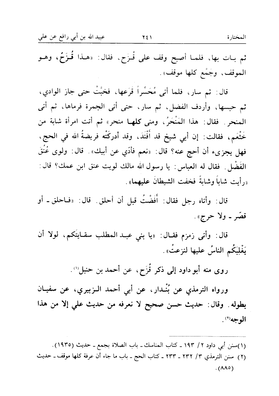 ثُمَّ بَاتَ بِهَا فَلَمَّا أَصْبَحَ وَقَفَ عَلَى قُزَحَ فَقَالَ هَذَا قُزَحُ وَهُوَ الْمَوْقِفُ وَجَمْعٌ كُلُّهَا مَوْقِفٌ قَالَ ثُمَّ سَارَ فَلَمَّا أَتَى مُحَسِّرًا قَرَعَهَا فَخَبَّتْ حَتَّى جَازَ الْوَادِي ثُمَّ حَبَسَهَا وَأَرْدَفَ الْفَضْلَ ثُمَّ سَارَ حَتَّى أَتَى الْجَمْرَةَ فَرَمَاهَا ثُمَّ أَتَى الْمَنْحَرَ فَقَالَ هَذَا الْمَنْحَرُ وَمِنًى كُلُّهَا مَنْحَرٌ ثُمَّ أَتَتِ امْرَأَةٌ شَابَّةٌ مِنْ خَثْعَمٍ فَقَالَتْ إِنَّ أَبِي شَيْخٌ قَدْ أَفْنَدَ وَقَدْ أَدْرَكَتْهُ فَرِيضَةُ اللَّهِ فِي الْحَجِّ فَهَلْ يُجْزِئُ أَنْ أَحُجَّ عَنْهُ قَالَ نَعَمْ فَأَدِّي عَنْ أَبِيكِ قَالَ وَلَوَى عُنُقَ الْفَضْلِ فَقَالَ لَهُ الْعَبَّاسُ يَا رَسُولَ اللَّهِ مَالك لَوَيْتَ عُنُقَ ابْنِ عَمِّكَ قَالَ رَأَيْتُ شَابًّا وَشَابَّةً فَخِفْتُ الشَّيْطَانَ عَلَيْهِمَا قَالَ وَأَتَاهُ رَجُلٌ فَقَالَ أَفَضْتُ قَبْلَ أَنْ أَحْلِقَ قَالَ فَاحْلِقْ أَوْ قَصِّرْ وَلا حَرَجَ قَالَ وَأَتَى زَمْزَمَ فَقَالَ يَا بني عبد الْمطلب سِقَايَتَكُمْ لَوْلا أَنْ يَغْلِبَكُمُ النَّاسُ عَلَيْهَا لَنَزَعْتُ