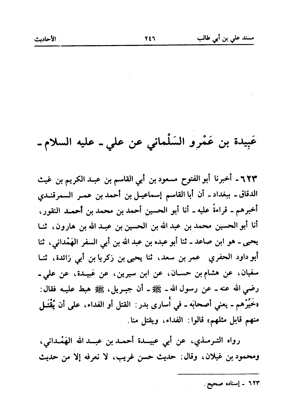 623 - أَخْبَرَنَا أَبُو الْفُتُوحِ مَسْعُودُ بْنُ أَبِي الْقَاسِم بن عبد الْكَرِيم بْنِ غَيْثٍ الدَّقَّاقُ بِبَغْدَادَ أَنَّ أَبَا الْقَاسِمِ إِسْمَاعِيلَ بْنَ أَحْمَدَ بْنِ عُمَرَ السَّمَرْقَنْدِيَّ أَخْبَرَهُمْ قِرَاءَةً عَلَيْهِ أَنَا أَبُو الْحُسَيْنِ أَحْمَدُ بْنُ مُحَمَّدِ بْنِ أَحْمَدَ النَّقُّورُ أَنَا أَبُو الْحُسَيْنِ مُحَمَّد بن عبد الله بن الْحُسَيْن بن عبد الله بْنِ هَارُونَ ثَنَا يَحْيَى هُوَ ابْنُ صَاعِدٍ ثَنَا أَبُو عَبده بن عبد الله بْنِ أَبِي السَّفَرِ الْهَمْدَانِيُّ ثَنَا أَبُو دَاوُدَ الْحَفَرِيُّ عُمَرُ بْنُ سَعْدٍ ثَنَا يَحْيَى بْنُ زَكَرِيَّا بْنِ أَبِي زَائِدَةَ ثَنَا سُفْيَانُ عَنْ هِشَامِ بْنِ حَسَّانَ عَنِ ابْنِ سِيرِينَ عَنْ عُبَيْدَةَ عَنْ عَلِيٍّ رَضِيَ اللَّهُ عَنْهُ عَنْ رَسُولُ اللَّهِ صَلَّى اللَّهُ عَلَيْهِ وَسَلَّمَ أَنَّ جِبْرِيلَ صَلَّى اللَّه عَلَيْهِ وَسَلَّمَ هَبَطَ عَلَيْهِ فَقَالَ خَيِّرْهُمْ يَعْنِي أَصْحَابَهُ فِي أُسَارَى بَدْرٍ الْقَتْلَ أَوِ الْفِدَاءَ عَلَى أَنْ يُقْتَلَ مِنْهُمْ قَابِلَ مِثْلُهُمْ قَالُوا الْفِدَاءُ وَيُقْتَلُ مِنَّا