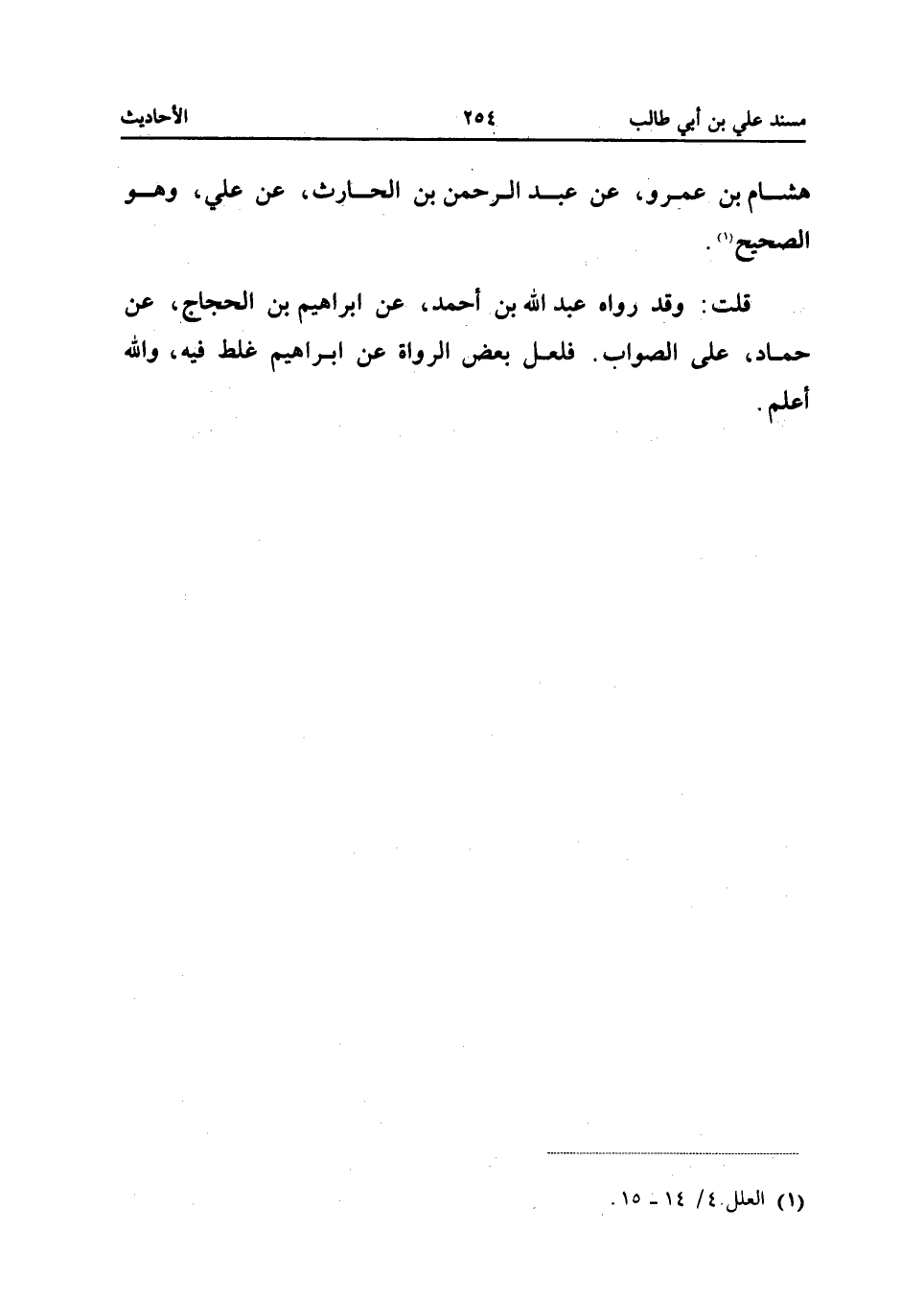 هِشَام بن عَمْرو عَن عبد الرَّحْمَن بْنِ الْحَارِثِ عَنْ عَلِيٍّ وَهُوَ الصَّحِيحُ قُلْتُ وَقد رَوَاهُ عبد الله بْنُ أَحْمَدَ عَنْ إِبْرَاهِيمَ بْنِ الْحَجَّاجِ عَنْ حَمَّادٍ عَلَى الصَّوَابِ فَلَعَلَّ بَعْضَ الرُّوَاةِ عَنْ إِبْرَاهِيم غلط فِيهِ وَالله أعلم (إِسْنَاده حسن)