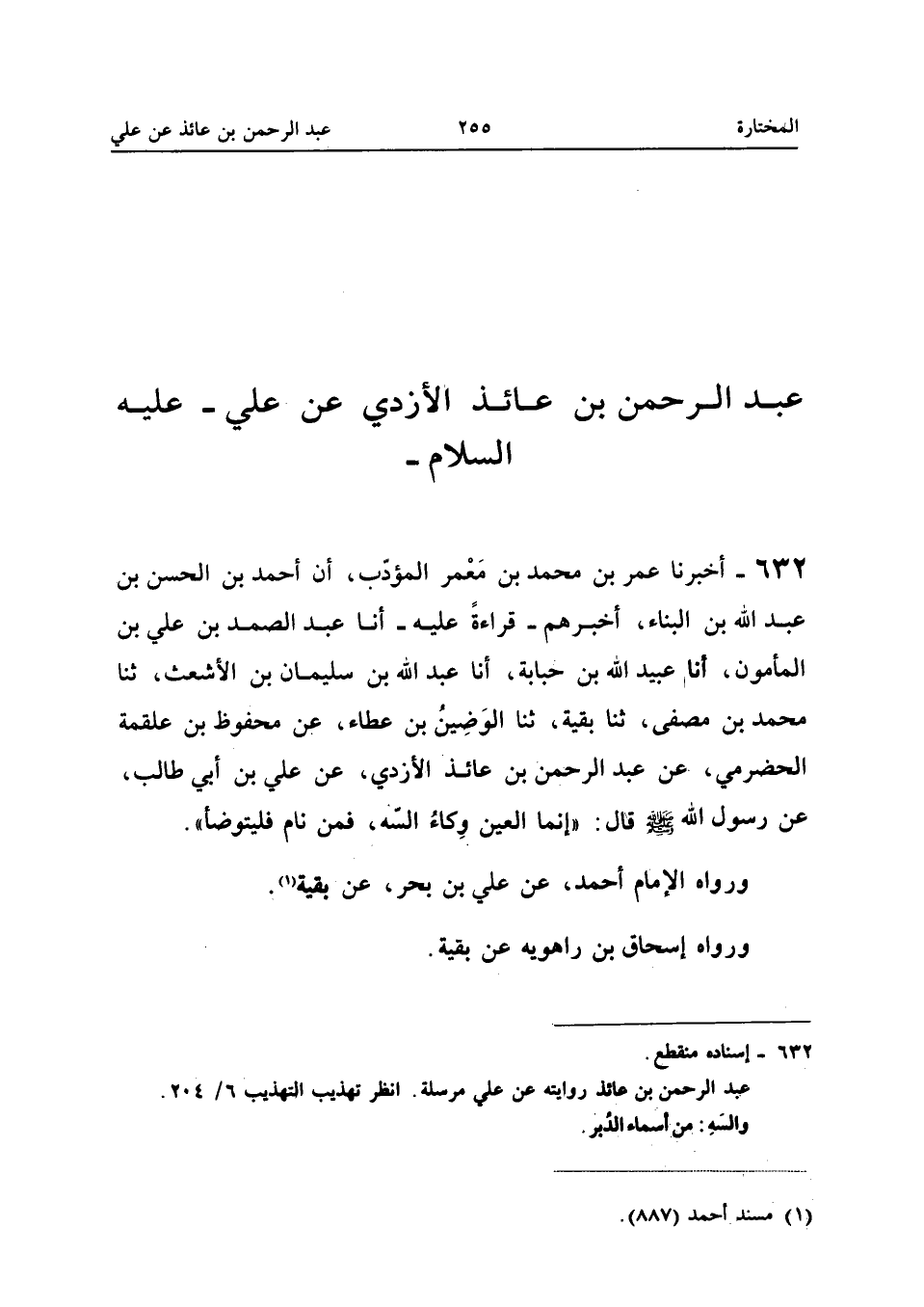 632 - أَخْبَرَنَا عُمَرُ بْنُ مُحَمَّدِ بْنِ مَعْمَرٍ الْمُؤَدِّبُ أَن أَحْمد بن الْحسن بن عبد الله بن الْبناء أخْبرهُم قِرَاءَة عَلَيْهِ أَنا عبد الصَّمد بن عَليّ بن الْمَأْمُون أَنا عبيد الله بن حبابة أَنا عبد الله بْنُ سُلَيْمَانَ بْنِ الأَشْعَثِ ثَنَا مُحَمَّدُ بْنُ مُصَفَّى ثَنَا بَقِيَّةُ ثَنَا الْوَضِينُ بْنُ عَطَاءٍ عَن مَحْفُوظ بن عَلْقَمَة الْحَضْرَمِيّ عَن عبد الرَّحْمَن بْنِ عَائِذٍ الأَزْدِيِّ عَنْ عَلِيِّ بْنِ أَبِي طَالِبٍ عَنْ رَسُولِ اللَّهِ صَلَّى اللَّه عَلَيْهِ وَسَلَّمَ قَالَ إِنَّمَا الْعَيْنُ وِكَاءُ السَّهِ فَمَنْ نَامَ فَلْيَتْوَضَّأْ