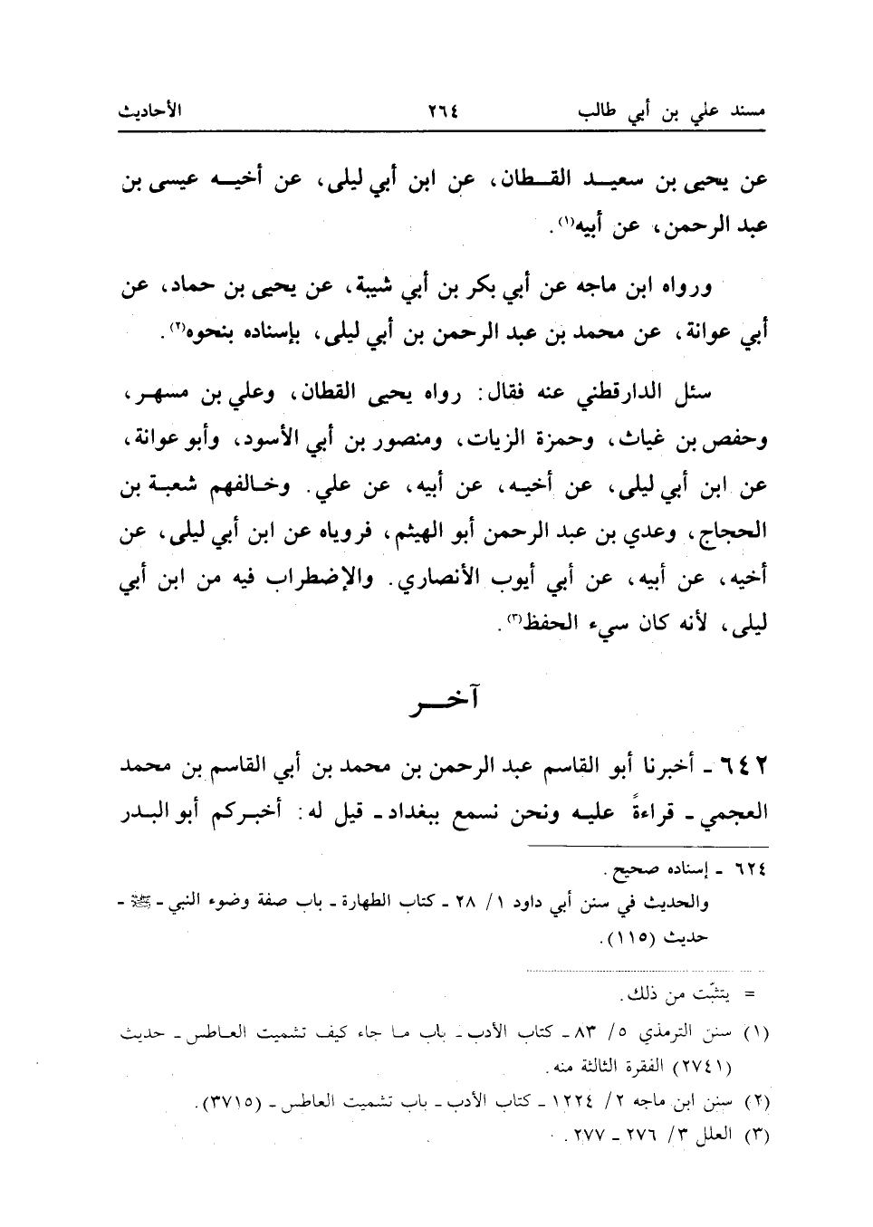 عَنْ يَحْيَى بْنِ سَعِيدٍ الْقَطَّانِ عَنِ ابْنِ أبي ليلى عَن أَخِيه عِيسَى بن عبد الرَّحْمَن عَنْ أَبِيهِ وَرَوَاهُ ابْنُ مَاجَهْ عَنْ أَبِي بَكْرِ بْنِ أَبِي شَيْبَةَ عَنْ يَحْيَى بْنِ حَمَّادٍ عَنْ أَبِي عَوَانَةَ عَنْ مُحَمَّدِ بْنِ عبد الرَّحْمَن بْنِ أَبِي لَيْلَى بِإِسْنَادِهِ بِنَحْوِهِ سُئِلَ الدَّارَقُطْنِيُّ عَنْهُ فَقَالَ رَوَاهُ يَحْيَى الْقَطَّانُ وَعَلِيُّ بْنُ مُسْهِرٍ وَحَفْصُ بْنُ غِيَاثٍ وَحَمْزَةُ الزَّيَّاتُ وَمَنْصُورُ بْنُ أَبِي الأَسْوَدِ وَأَبُو عَوَانَةَ عَنِ ابْنِ أَبِي لَيْلَى عَنْ أَخِيهِ عَنْ أَبِيهِ عَنْ عَلِيٍّ وَخَالَفَهُمْ شُعْبَةُ بْنُ الْحَجَّاجِ وَعَدِيُّ بْنُ عبد الرَّحْمَن أَبُو الْهَيْثَمِ فَرَوَيَاهُ عَنِ ابْنِ أَبِي لَيْلَى عَنْ أَخِيهِ عَنْ أَبِيهِ عَنْ أَبِي أَيُّوبَ الأَنْصَارِيِّ وَالاضْطِرَابُ فِيهِ مِنَ ابْنِ أَبِي لَيْلَى لِأَنَّهُ كَانَ سيء الْحِفْظ (إِسْنَاده حسن)