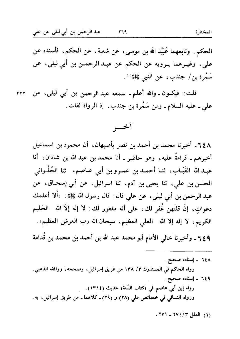 648 - أَخْبَرَنَا مُحَمَّدُ بْنُ أَحْمَدَ بْنِ نَصْرٍ بِأَصْبَهَانَ أَنَّ مَحْمُودَ بْنَ إِسْمَاعِيلَ أَخْبَرَهُمْ قِرَاءَةً عَلَيْهِ وَهُوَ حَاضر أَنا مُحَمَّد بن عبد الله بن شَاذان أَنا عبد الله الْقَبَّابُ ثَنَا أَحْمَدُ بْنُ عَمْرِو بْنِ أَبِي عَاصِمٍ ثَنَا الْحُلْوَانِيُّ الْحَسَنُ بْنُ عَلِيٍّ ثَنَا يَحْيَى بْنُ آدَمَ ثَنَا إِسْرَائِيلُ عَنْ أَبِي إِسْحَاق عَن عبد الرَّحْمَن بْنِ أَبِي لَيْلَى عَنْ عَلِيٍّ قَالَ قَالَ رَسُولِ اللَّهِ صَلَّى اللَّهُ عَلَيْهِ وَسَلَّمَ إِلا أُعَلِّمُكَ دَعَوَاتٍ إِنْ قُلْتَهُنَّ غُفِرَ لَكَ عَلَى أَنَّهُ مَغْفُورٌ لَكَ لَا إِلَهَ إِلَّا اللَّهُ الْحَلِيمُ الْكَرِيمُ لَا إِلَهَ إِلَّا اللَّهُ الْعَلِيُّ الْعَظِيم سُبْحَانَ الله رب الْعَرْش الْعَظِيم (إِسْنَاده صَحِيح)