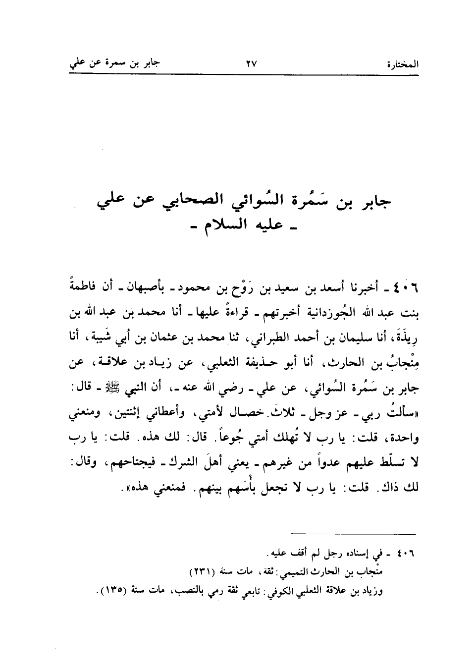 406 - أَخْبَرَنَا أَسْعَدُ بْنُ سَعِيدِ بْنِ رَوْحِ بن مَحْمُود بأصبهان أَن فَاطِمَة بنت عبد الله الجوزدانية قِرَاءَة عَلَيْهَا أَنا مُحَمَّد بن عبد الله بْنِ رِيذَةَ أَنَا سُلَيْمَانُ بْنُ أَحْمَدَ الطَّبَرَانِيُّ ثَنَا مُحَمَّدُ بْنُ عُثْمَانَ بْنِ أَبِي شَيْبَةَ أَنَا مِنْجَابُ بْنُ الْحَارِثِ أَنَا أَبُو حُذَيْفَةَ الثَّعْلَبِيُّ عَنْ زِيَادِ بْنِ عِلاقَةَ عَنْ جَابِرِ بْنِ سَمُرَةَ السُّوَائِيِّ عَنْ عَلِيٍّ رَضِيَ اللَّهُ عَنْهُ أَنَّ النَّبِيَّ صَلَّى اللَّه عَلَيْهِ وَسَلَّمَ قَالَ سَأَلْتُ رَبِّي عَزَّ وَجَلَّ ثَلاثَ خِصَالٍ لأُمَّتِي وَأَعْطَانِي اثْنَتَيْنِ وَمَنَعَنِي وَاحِدَةً قُلْتُ يَا رَبِّ لَا تُهْلِكْ أُمَّتِي جُوعًا قَالَ لَكَ هَذِهِ قُلْتُ يَا رَبِّ لَا تُسَلِّطْ عَلَيْهِمْ عَدُوًّا مِنْ غَيْرِهِمْ يَعْنِي أَهْلَ الشِّرْكِ فَيَجْتَاحَهُمْ وَقَالَ لَكَ ذَاكَ قُلْتُ يَا رَبِّ لَا تَجْعَلْ بَأْسَهُمْ بَيْنَهُمْ فَمَنَعَنِي هَذِهِ