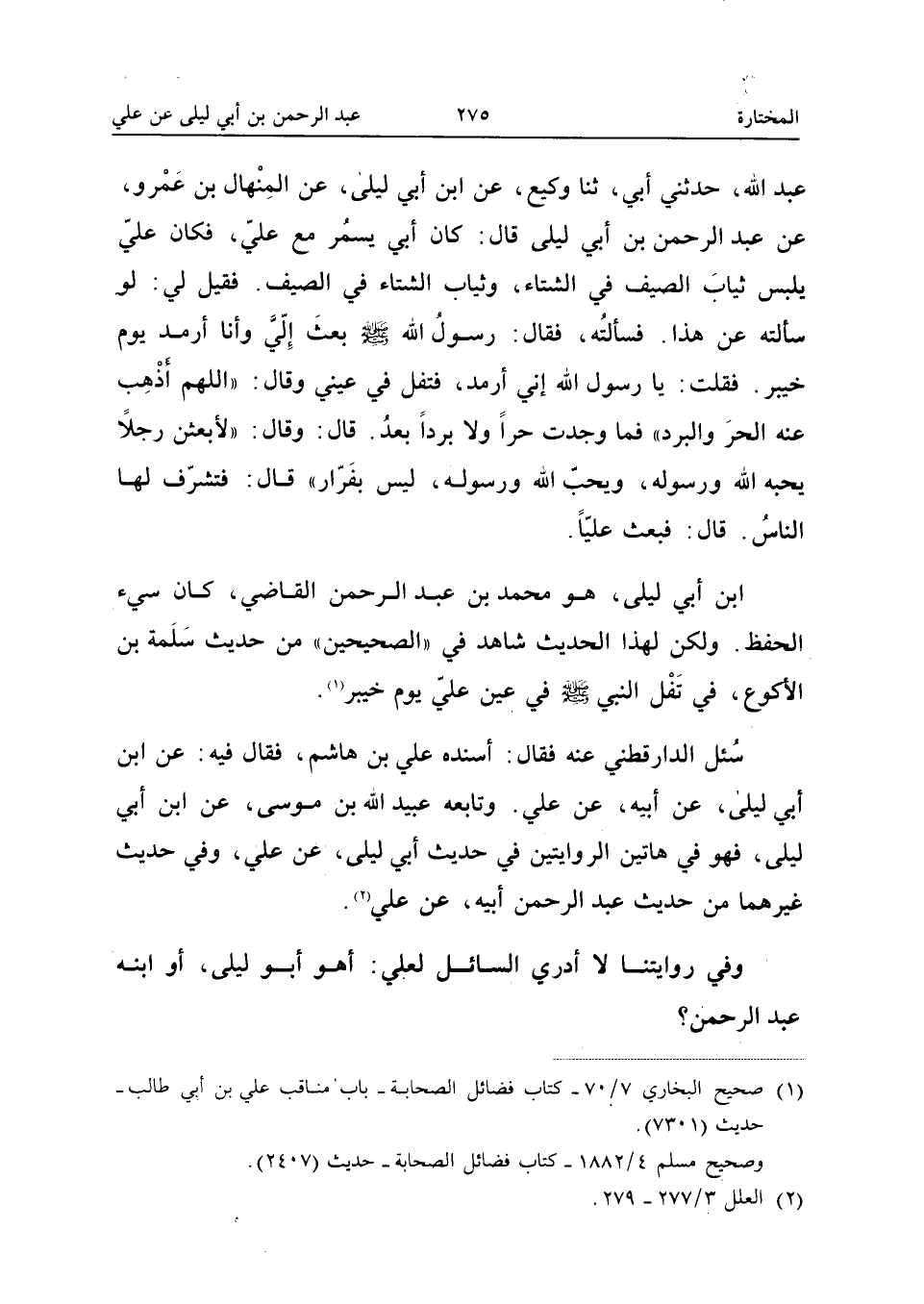 ابْنُ أَبِي لَيْلَى هُوَ مُحَمَّد بن عبد الرَّحْمَن القَاضِي كَانَ سيء الْحِفْظِ وَلَكِن لِهَذَا الْحَدِيثِ شَاهِدٌ فِي الصَّحِيحَيْنِ مِنْ حَدِيثِ سَلَمَةَ بْنِ الأَكْوَعِ فِي تَفَلَ النَّبِيِّ صَلَّى اللَّه عَلَيْهِ وَسَلَّمَ فِي عَيْنِ عَلِيٍّ يَوْمَ خَيْبَرَ سُئِلَ الدَّارَقُطْنِيُّ عَنْهُ فَقَالَ أَسْنَدَهُ عَلِيُّ بْنُ هَاشِمٍ فَقَالَ فِيهِ عَنِ ابْنِ أَبِي لَيْلَى عَنْ أَبِيهِ عَنْ عَلِيٍّ وَتَابعه عبيد الله بْنُ مُوسَى عَنِ ابْنِ أَبِي لَيْلَى فَهُوَ فِي هَاتَيْنِ الرِّوَايَتَيْنِ فِي حَدِيثِ أَبِي لَيْلَى عَنْ عَلِيٍّ وَفِي حَدِيثٍ غَيْرِهِمَا مِنْ حَدِيثِ عبد الرَّحْمَن أَبِيهِ عَنْ عَلِيٍّ وَفِي رِوَايَتِنَا لَا أَدْرِي السَّائِلَ لِعَلِيٍّ أَهُوَ أَبُو لَيْلَى أَوِ ابْنُهُ عبد الرَّحْمَن (إِسْنَاده حسن)