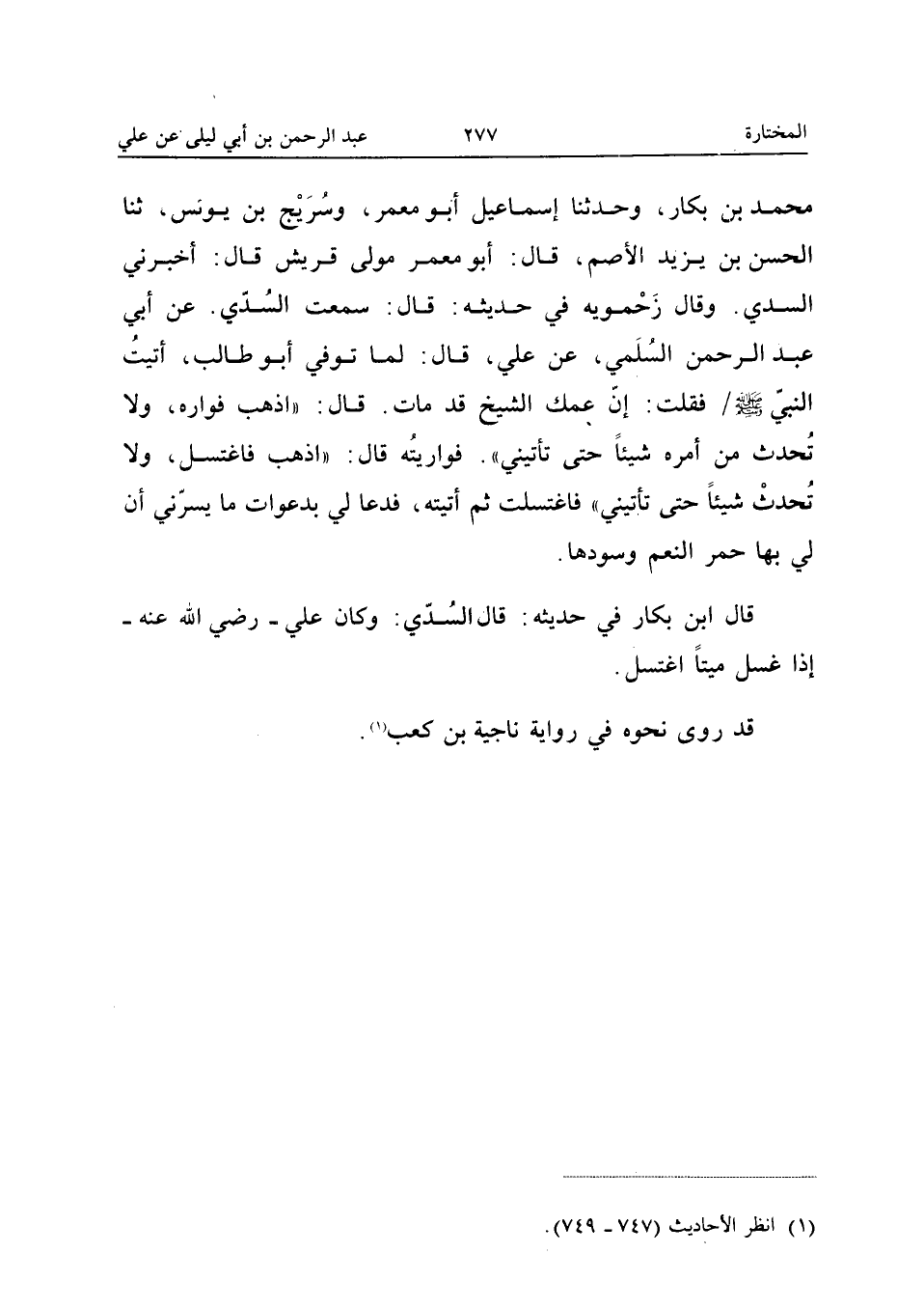 مُحَمَّدُ بْنُ بَكَّارٍ وحَدَّثَنَا إِسْمَاعِيلُ أَبُو مَعْمَرٍ وَسُرَيْجُ بْنُ يُونُسَ ثَنَا الْحَسَنُ بْنُ يَزِيدَ الأَصَمُّ قَالَ أَبُو مَعْمَرٍ مَوْلَى قُرَيْشٍ قَالَ أَخْبَرَنِي السُّدِّيُّ وَقَالَ زَحْمُوَيْهِ فِي حَدِيثِهِ قَالَ سَمِعت السّديّ عَن أبي عبد الرَّحْمَن السُّلَمِيِّ عَنْ عَلِيٍّ قَالَ لَمَّا تُوُفِّيَ أَبُو طَالِبٍ أَتَيْتُ النَّبِيَّ صَلَّى اللَّه عَلَيْهِ وَسَلَّمَ فَقُلْتُ إِنَّ عَمَّكَ الشَّيْخَ قَدْ مَاتَ قَالَ اذْهَبْ فَوَارِهِ وَلا تُحْدِثْ مِنْ أَمْرِهِ شَيْئًا حَتَّى تَأْتِيَنِي فَوَارَيْتُهُ قَالَ اذْهَبْ فَاغْتَسِلْ وَلا تُحْدِثْ شَيْئًا حَتَّى تَأْتِيَنِي فَاغْتَسَلْتُ ثُمَّ أَتَيْتُهُ فَدَعَا لِي بِدَعَوَاتٍ مَا يَسُرُّنِي أَنَّ لِي بِهَا حُمُرَ النَّعَمِ وَسُودَهَا