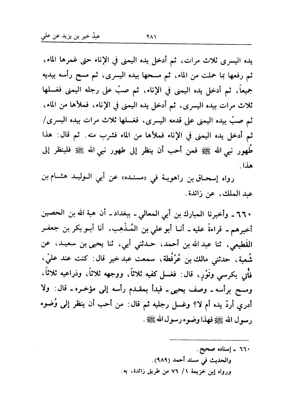 660 - وأَخْبَرَنَا الْمُبَارَكُ بْنُ أَبِي الْمَعَالِي بِبَغْدَادَ أَنَّ هِبَةَ اللَّهِ بْنَ الْحُصَيْنِ أَخْبَرَهُمْ قِرَاءَةً عَلَيْهِ أَنا أَبُو عَلِيِّ بْنُ الْمُذْهِبِ أَنا أَبُو بكر بن جَعْفَر الْقطيعِي ثَنَا عبد الله بْنِ أَحْمَدَ حَدَّثَنِي أَبِي ثَنَا يَحْيَى بْنُ سَعِيدٍ عَنْ شُعْبَةَ حَدَّثَنِي مَالِكُ بْنُ عُرْفُطَةَ سَمِعْتُ عَبْدَ خَيْرٍ قَالَ كُنْتُ عِنْدَ عَلِيٍّ فَأُتِيَ بِكُرْسِيٍّ وَتَوْرٍ قَالَ فَغَسَلَ كَفَّيْهِ ثَلاثًا وَوَجْهَهُ ثَلاثًا وَذِرَاعَيْهِ ثَلاثًا وَمَسَحَ بِرَأْسِهِ وَصَفَ يَحْيَى فَبَدَأَ بِمُقَدَّمِ رَأْسِهِ إِلَى مُؤَخَّرِهِ قَالَ وَلا أَدْرِي أَرَدَّ يَدَهُ أَمْ لَا وَغَسَلَ رِجْلَيْهِ ثُمَّ قَالَ مَنْ أَحَبَّ أَنْ يَنْظُرَ إِلَى وُضُوءِ رَسُولِ اللَّهِ صَلَّى اللَّهُ عَلَيْهِ وَسَلَّمَ فَهَذَا وُضُوءُ رَسُولِ اللَّهِ صَلَّى اللَّهُ عَلَيْهِ وَسلم