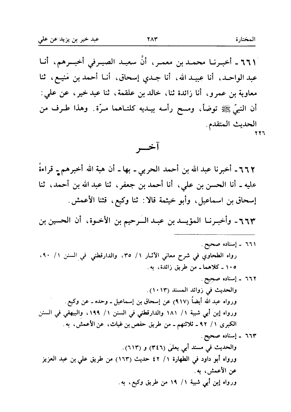 663 - وَأخْبرنَا الْمُؤَيد بن عبد الرَّحِيم بن الْأُخوة أَن الْحُسَيْن بن عبد الْملك الأَدِيبَ أَخْبَرَهُمْ قِرَاءَةً عَلَيْهِ ثَنَا إِبْرَاهِيمُ بْنُ مَنْصُور أَنا مُحَمَّد بن إِبْرَاهِيم بن الْمُقْرِئِ أَنَا أَحْمَدُ بْنُ عَلِيِّ بْنِ الْمُثَنَّى ثَنَا أَبُو خَيْثَمَةَ ثَنَا وَكِيعٌ عَنْ أَبِي إِسْحَاقَ عَنْ عَبْدِ خَيْرٍ عَنْ عَلِيٍّ قَالَ كُنْتُ أَرَى بَاطِنَ الْقَدَمَيْنِ أَحَقَّ بِالْمَسْحِ مِنْ ظَاهِرِهِمَا حَتَّى رَأَيْتُ رَسُولَ اللَّهِ صَلَّى اللَّه عَلَيْهِ وَسَلَّمَ يَمْسَحُ ظَاهِرَهُمَا