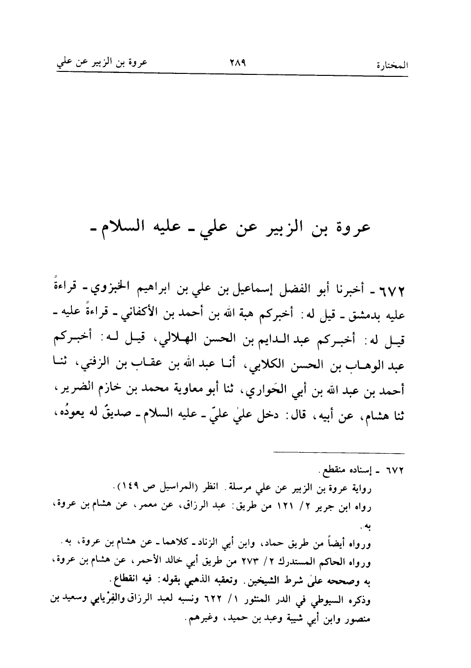 عُرْوَةُ بْنُ الزُّبَيْرِ عَنْ عَلِيٍّ عَلَيْهِ السَّلامُ
