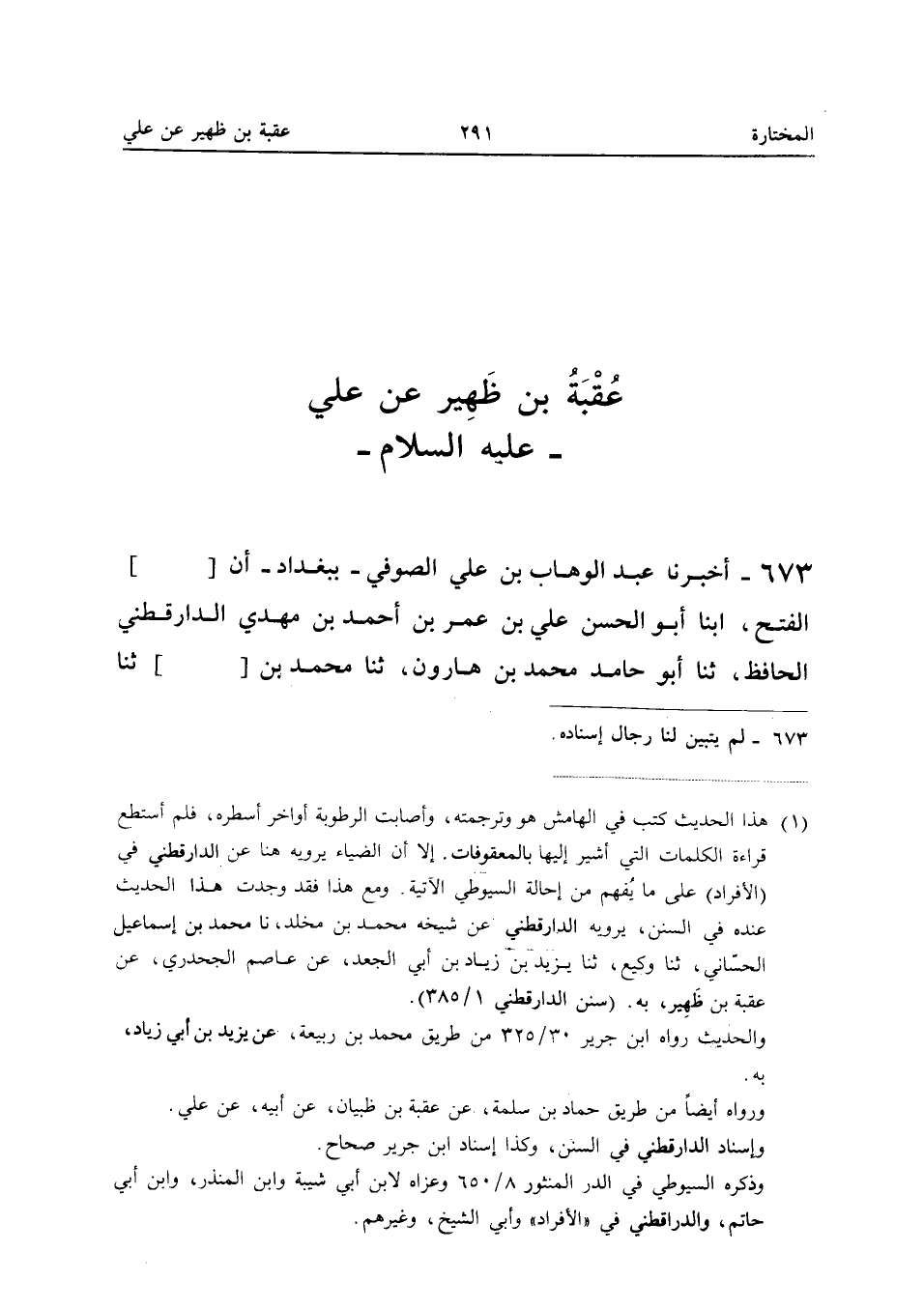 673 - أخبرنَا عبد الْوَهَّاب بْنُ عَلِيٍّ الصُّوفِيُّ بِبَغْدَادَ أَنَّ الْفَتْح أَبْنَا أَبُو الْحَسَنِ عَلِيُّ بْنُ عُمَرَ بْنِ أَحْمَدَ بْنِ مَهْدِيٍّ الدَّارَقُطْنِيُّ الْحَافِظُ ثَنَا أَبُو حَامِدٍ مُحَمَّدُ بْنُ هَارُونَ ثَنَا مُحَمَّدُ بْنُ ثَنَا