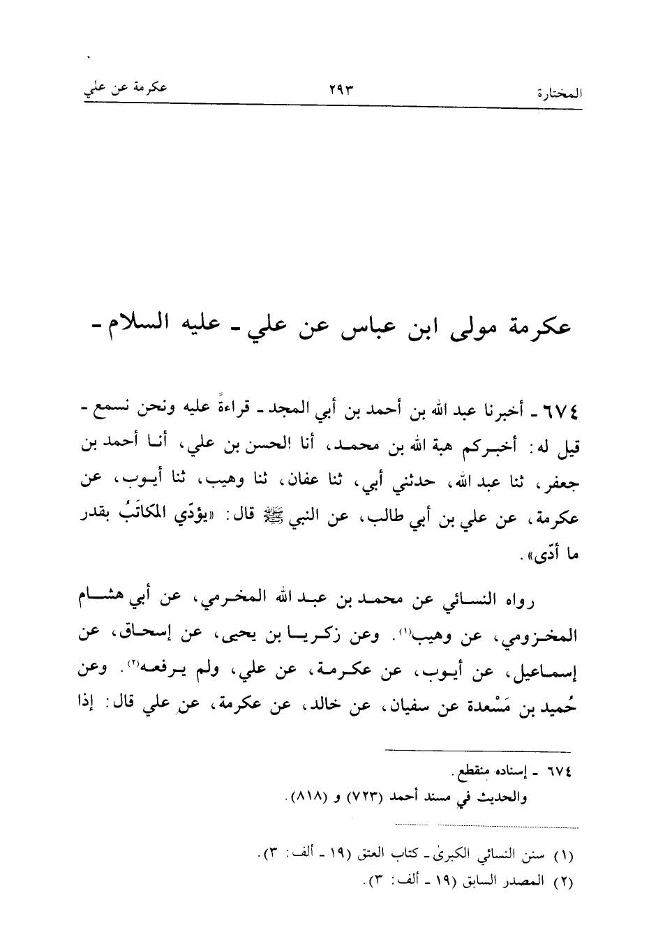 674 - أخبرنَا عبد الله بْنُ أَحْمَدَ بْنِ أَبِي الْمَجْدِ قِرَاءَةً عَلَيْهِ وَنَحْنُ نَسْمَعُ قِيلَ لَهُ أَخْبَرَكُمْ هِبَةُ اللَّهِ بْنُ مُحَمَّدٍ أَنَا الْحَسَنُ بْنُ عَلِيٍّ أَنَا أَحْمد بن جَعْفَر ثَنَا عبد الله حَدَّثَنِي أَبِي ثَنَا عَفَّانُ ثَنَا وُهَيْبٌ ثَنَا أَيُّوبُ عَنْ عِكْرِمَةَ عَنْ عَلِيِّ بْنِ أَبِي طَالِبٍ عَنِ النَّبِيِّ صَلَّى اللَّهُ عَلَيْهِ وَسَلَّمَ قَالَ يُؤَدِّي الْمُكَاتِبُ بِقَدْرِ مَا أَدَّى