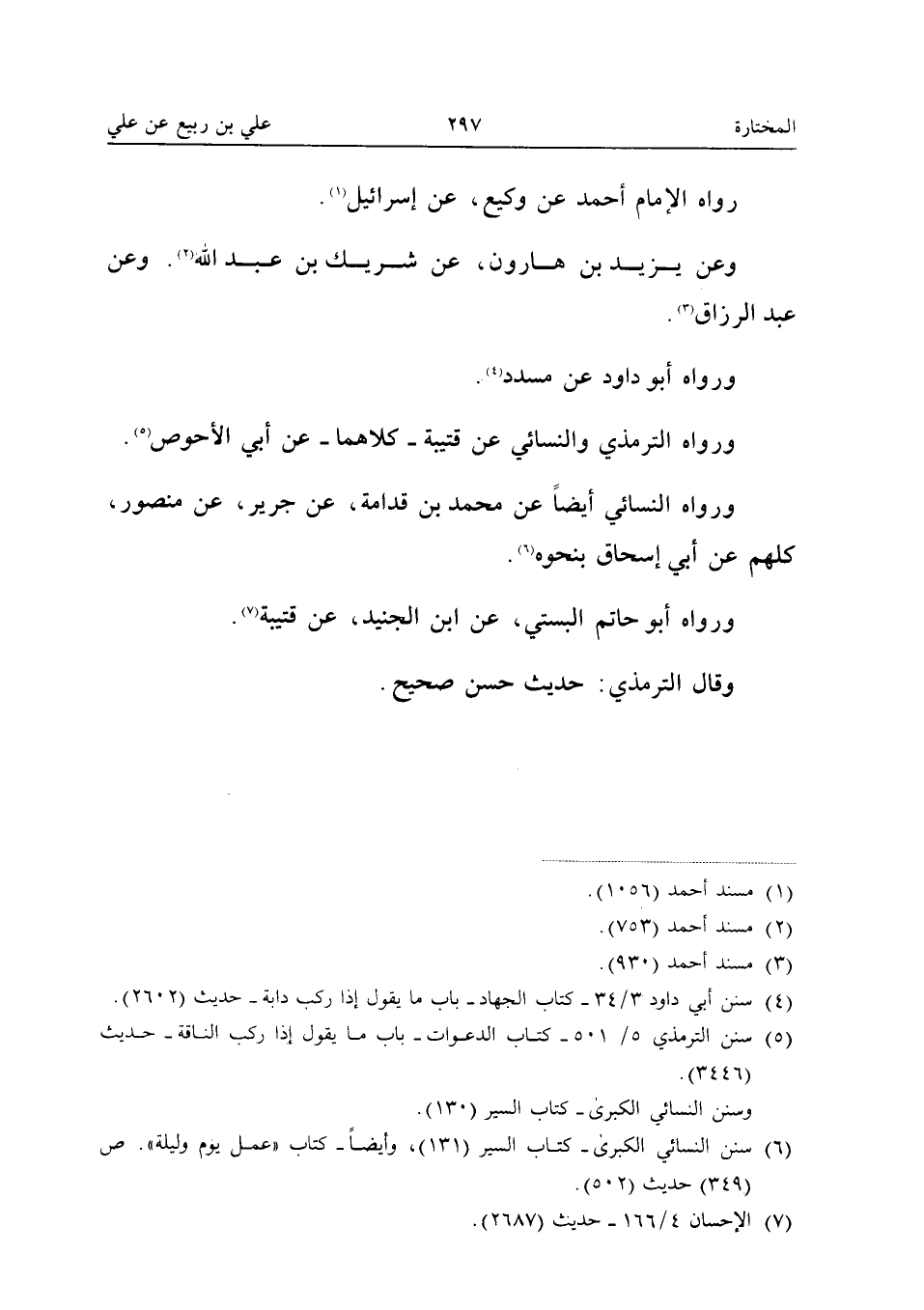 رَوَاهُ الإِمَامُ أَحْمَدُ عَنْ وَكِيعٍ عَنْ إِسْرَائِيلَ وَعَنْ يَزِيدَ بْنِ هَارُونَ عَنْ شَرِيكِ بْنِ عبد الله وَعَن عبد الرَّزَّاق وَرَوَاهُ أَبُو دَاوُدَ عَنْ مُسَدَّدٍ وَرَوَاهُ التِّرْمِذِيُّ وَالنَّسَائِيُّ عَنْ قُتَيْبَةَ كِلاهُمَا عَنْ أَبِي الأَحْوَصِ وَرَوَاهُ النَّسَائِيُّ أَيْضًا عَنْ مُحَمَّدِ بْنِ قُدَامَةَ عَنْ جَرِيرٍ عَنْ مَنْصُورٍ كُلِّهِمْ عَنْ أَبِي إِسْحَاقَ بِنَحْوِهِ وَرَوَاهُ أَبُو حَاتِمٍ الْبُسْتِيُّ عَنِ ابْنِ الْجُنَيْدِ عَنْ قُتَيْبَةَ وَقَالَ التِّرْمِذِيُّ حَدِيثٌ حسن صَحِيح (إِسْنَاده صَحِيح)