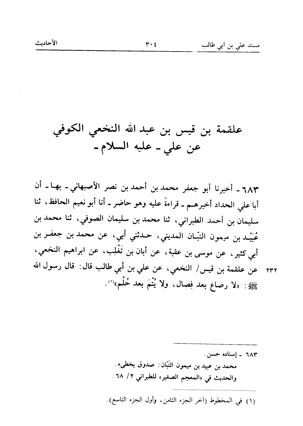 683 - أَخْبَرَنَا أَبُو جَعْفَرٍ مُحَمَّدُ بْنُ أَحْمَدَ بْنِ نَصْرٍ الأَصْبَهَانِيُّ بِهَا أَنَّ أَبَا عَلِيٍّ الْحَدَّادُ أَخْبَرَهُمْ قِرَاءَةً عَلَيْهِ وَهُوَ حَاضِرٌ أَنا أَبُو نُعَيْمٍ الْحَافِظ ثَنَا سُلَيْمَانُ بْنُ أَحْمَدَ الطَّبَرَانِيُّ ثَنَا مُحَمَّدُ بْنُ سُلَيْمَانَ الصُّوفِيُّ ثَنَا مُحَمَّدُ بْنُ عُبَيْدِ بْنِ مَيْمُونٍ التَّبَّانُ الْمَدِينِيُّ حَدَّثَنِي أَبِي عَنْ مُحَمَّدِ بْنِ جَعْفَرِ بْنِ أَبِي كَثِيرٍ عَنْ مُوسَى بْنِ عُقْبَةَ عَنْ أَبَانِ بْنِ تَغْلِبَ عَنْ إِبْرَاهِيمَ النَّخَعِيِّ عَنْ عَلْقَمَةَ بْنِ قَيْسٍ النَّخَعِيِّ عَنْ عَلِيِّ بْنِ أَبِي طَالِبٍ قَالَ قَالَ رَسُولِ اللَّهِ صَلَّى اللَّهُ عَلَيْهِ وَسَلَّمَ لَا رَضَاعَ بَعْدَ فِصَالٍ وَلا يُتْمَ بَعْدَ حُلُمٍ (إِسْنَاده حسن)