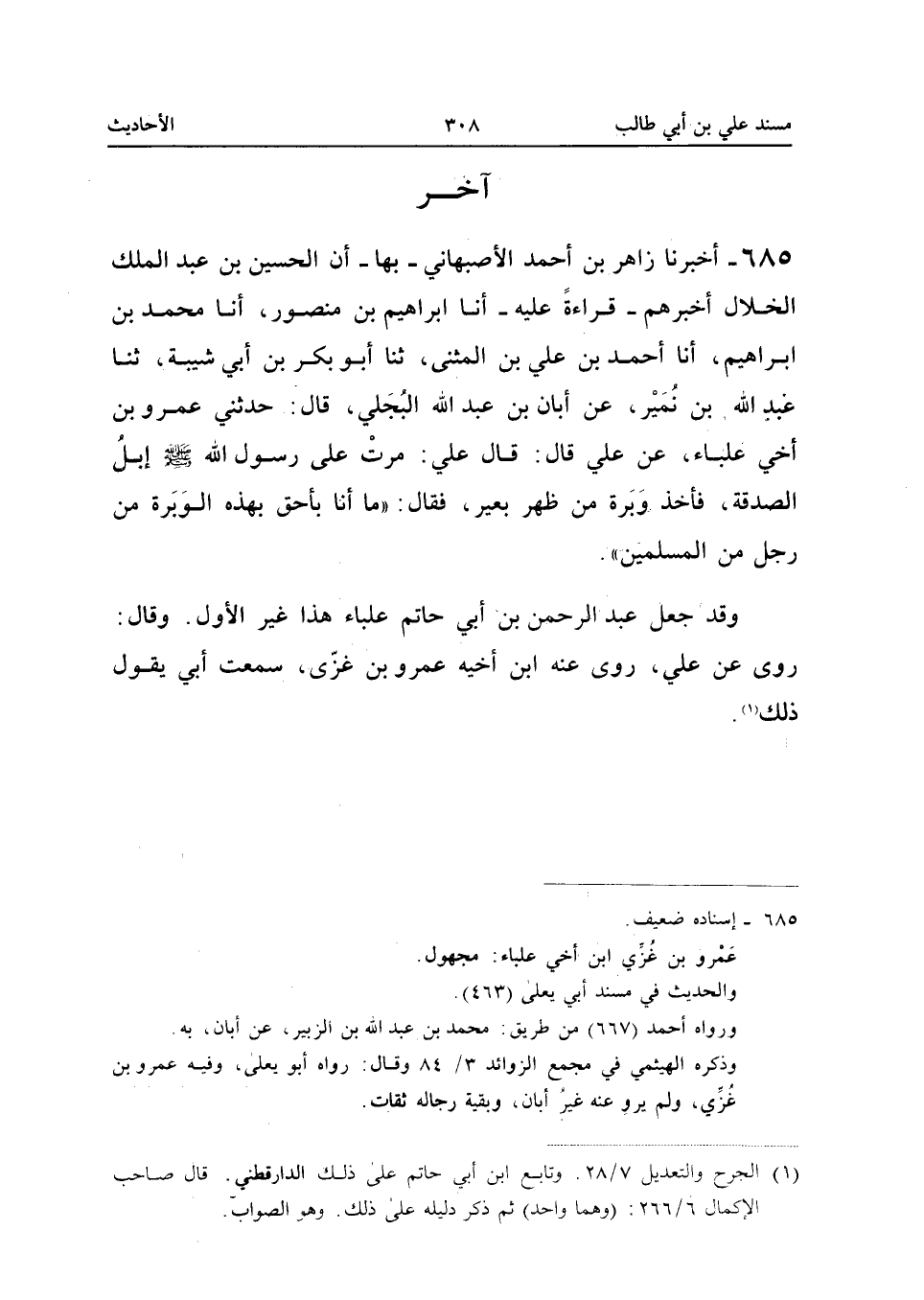 685 - أَخْبَرَنَا زَاهِرُ بْنُ أَحْمَدَ الأَصْبَهَانِيُّ بِهَا أَن الْحُسَيْن بن عبد الْملك الْخَلالَ أَخْبَرَهُمْ قِرَاءَةً عَلَيْهِ أَنا إِبْرَاهِيمُ بْنُ مَنْصُورٍ أَنا مُحَمَّدُ بْنُ إِبْرَاهِيمَ أَنا أَحْمَدُ بْنُ عَلِيِّ بْنِ الْمُثَنَّى ثَنَا أَبُو بَكْرِ بن أبي شيبَة ثَنَا عبد الله بن نمير عَن أبان بن عبد الله البَجلِيّ قَالَ حَدثنِي عَمْرو بن أَخِي عِلْبَاءَ عَنْ عَلِيٍّ قَالَ قَالَ عَلِيٌّ مَرَّتْ عَلَى رَسُولِ اللَّهِ صَلَّى اللَّه عَلَيْهِ وَسَلَّمَ إِبِلُ الصَّدَقَةِ فَأَخَذَ وَبَرَةً مِنْ ظَهْرِ بَعِيرٍ فَقَالَ مَا أَنَا بِأَحَقَّ بِهَذِهِ الْوَبَرَةِ من رجل من الْمُسلمين
