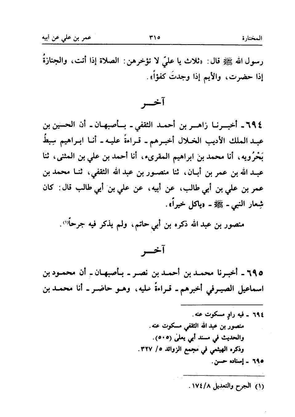 694 - أَخْبَرَنَا زَاهِرُ بْنُ أَحْمَدَ الثَّقَفِيُّ بِأَصْبَهَانَ أَن الْحُسَيْن بن عبد الْملك الأَدِيبَ الْخَلَّالَ أَخْبَرَهُمْ قِرَاءَةً عَلَيْهِ أَنَا إِبْرَاهِيمُ سِبْطُ بَحْرَوَيْهِ أَنَا مُحَمَّدُ بْنُ إِبْرَاهِيمَ الْمُقْرِئُ أَنا أَحْمَدُ بْنُ عَلِيِّ بْنِ الْمُثَنَّى ثَنَا عبد الله بْنُ عُمَرَ بْنِ أَبَانٍ ثَنَا مَنْصُورُ بْنُ عبد الله الثَّقَفِيُّ ثَنَا مُحَمَّدُ بْنُ عُمَرَ بْنِ عَلِيِّ بْنِ أَبِي طَالِبٍ عَنْ أَبِيهِ عَنْ عَلِيٍّ بْنِ أَبِي طَالِبٍ قَالَ كَانَ شِعَارُ النَّبِيِّ صلى الله عَلَيْهِ وَسلم يَأْكُل خيرا