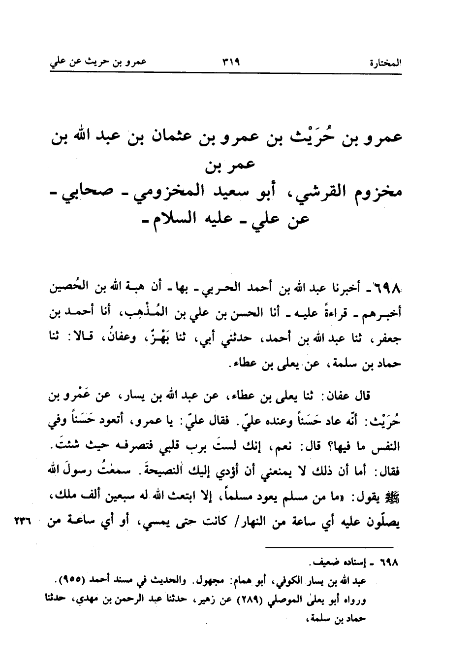 698 - أَخْبَرَنَا عبد الله بْنُ أَحْمَدَ الْحَرْبِيُّ بِهَا أَنَّ هِبَةَ اللَّهِ بْنَ الْحُصَيِن أَخْبَرَهُمْ قِرَاءَةً عَلَيْهِ أَنَا الْحَسَنُ بْنُ عَلِيِّ بْنِ الْمُذْهِبِ أَنا أَحْمَدُ بْنُ جَعْفَر ثَنَا عبد الله بْنُ أَحْمَدَ حَدَّثَنِي أَبِي ثَنَا بَهْزٌ وَعَفَّانُ قَالا ثَنَا حَمَّادُ بْنُ سَلَمَةَ عَنْ يَعْلَى بْنِ عَطَاءٍ قَالَ عَفَّانُ ثَنَا يَعْلَى بْنُ عَطاء عَن عبد الله بْنِ يَسَارٍ عَنْ عَمْرِو بْنِ حُرَيْثٍ أَنَّهُ عَادَ حَسَنًا وَعِنْدَهُ عَلِيٌّ فَقَالَ عَلِيٌّ يَا عَمْرُو أَتَعُودُ حَسَنًا وَفِي النَّفْسِ مَا فِيهَا قَالَ نَعَمْ إِنَّكَ لَسْتَ بِرَبِّ قَلْبِي فَتُصَرِّفُهُ حَيْثُ شِئْتَ فَقَالَ أَمَا أَنَّ ذَلِكَ لَا يَمْنَعُنِي أَنْ أُؤَدِّيَ إِلَيْكَ النَّصِيحَةَ سَمِعْتُ رَسُولَ اللَّهِ صَلَّى اللَّهُ عَلَيْهِ وَسَلَّمَ يَقُولُ مَا مِنْ مُسْلِمٍ يَعُودُ مُسْلِمًا إِلَّا ابْتَعَثَ اللَّهُ لَهُ سَبْعِينَ أَلْفَ مَلَكٍ يُصَلُّونَ عَلَيْهِ أَيَّ سَاعَةٍ مِنَ النَّهَارِ كَانَتْ حَتَّى يُمْسِيَ أَوْ أَيَّ سَاعَةٍ مِنَ