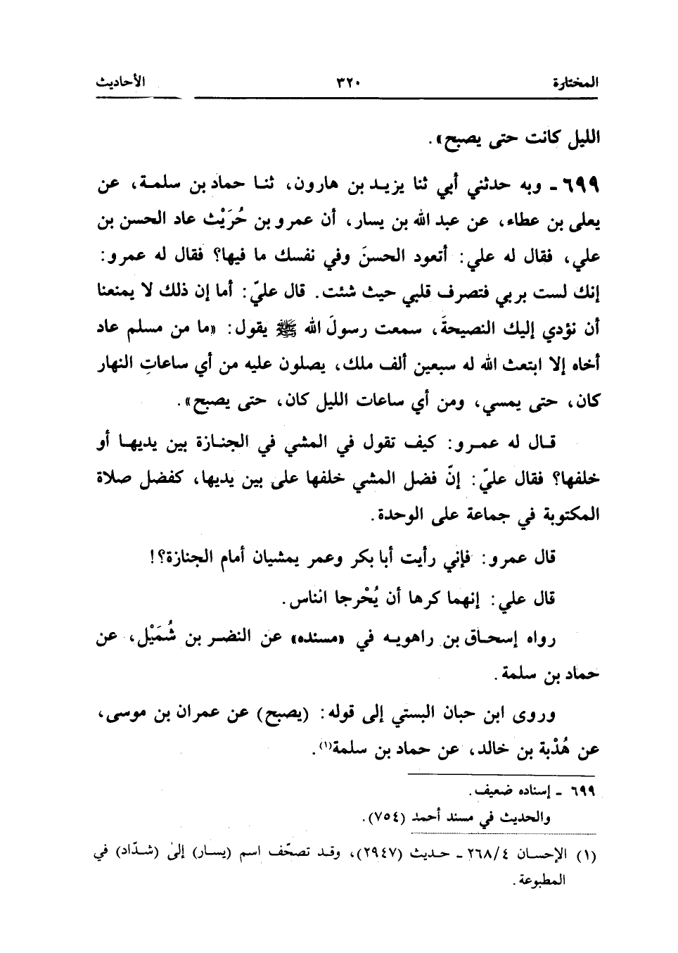 699 - وَبِهِ حَدَّثَنِي أَبِي ثَنَا يَزِيدُ بْنُ هَارُونَ ثَنَا حَمَّادُ بْنُ سَلَمَةَ عَنْ يَعْلَى بْنِ عَطاء عَن عبد الله بْنِ يَسَارٍ أَنَّ عَمْرَو بْنَ حُرَيْثٍ عَادَ الْحَسَنَ بْنَ عَلِيٍّ فَقَالَ لَهُ عَلِيٌّ أَتَعُودُ الْحَسَنَ وَفِي نَفْسِكَ مَا فِيهَا فَقَالَ لَهُ عَمْرٌو إِنَّكَ لَسْتَ بِرَبِّي فَتُصَرِّفُ قَلْبِي حَيْثُ شِئْتَ قَالَ عَلِيٌّ أَمَا إِنَّ ذَلِكَ لَا يَمْنَعُنَا أَنْ نُؤَدِّيَ إِلَيْكَ النَّصِيحَةَ سَمِعْتُ رَسُولَ اللَّهِ صَلَّى اللَّهُ عَلَيْهِ وَسَلَّمَ يَقُولُ مَا مِنْ مُسْلِمٍ عَادَ أَخَاهُ إِلَّا ابْتَعَثَ اللَّهُ لَهُ سَبْعِينَ أَلْفَ مَلَكٍ يُصَلُّونَ عَلَيْهِ مِنْ أَيِّ سَاعَاتِ النَّهَارِ كَانَ حَتَّى يُمْسِيَ وَمِنْ أَيِّ سَاعَاتِ اللَّيْلِ كَانَ حَتَّى يُصْبِحَ قَالَ لَهُ عَمْرٌو كَيْفَ تَقُولُ فِي الْمَشْيِ فِي الْجِنَازَةِ بَيْنَ يَدَيْهَا أَوْ خَلْفَهَا فَقَالَ عَلِيٌّ إِنَّ فَضْلَ الْمَشْيِ خَلْفَهَا عَلَى بَيْنَ يَدَيْهَا كَفَضْلِ صَلاةِ الْمَكْتُوبَةِ فِي جَمَاعَةٍ عَلَى الْوِحْدَةِ قَالَ عَمْرٌو فَإِنِّي رَأَيْتُ أَبَا بَكْرٍ وَعُمَرَ يَمْشِيَانِ أَمَامَ الْجِنَازَةِ قَالَ عَلِيٌّ إِنَّهُمَا كَرِهَا أَنْ يُحْرِجَا النَّاسَ