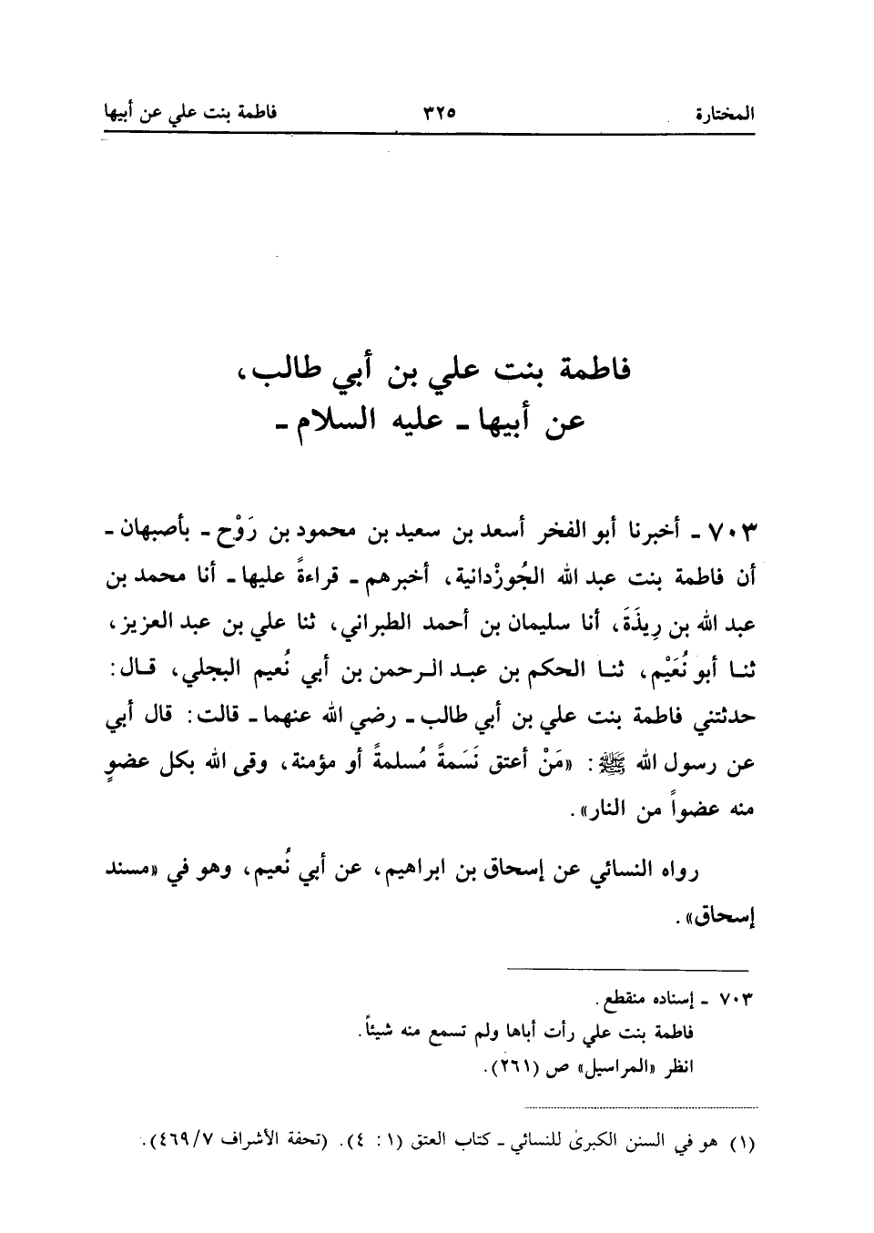 703 - أَخْبَرَنَا أَبُو الْفَخْرِ أَسْعَدُ بْنُ سَعِيدِ بْنِ مَحْمُودِ بْنِ رَوْحٍ بِأَصْبَهَانَ أَن فَاطِمَة بنت عبد الله الجوزدانية أخْبرهُم قِرَاءَة عَلَيْهَا أَنا مُحَمَّد بن عبد الله بْنِ رِيذَةَ أَنَا سُلَيْمَانُ بْنُ أَحْمَدَ الطَّبَرَانِيُّ ثَنَا عَليّ بن عبد الْعَزِيز ثَنَا أَبُو نعيم ثَنَا الحكم بن عبد الرَّحْمَن بْنِ أَبِي نُعَيْمٍ الْبَجَلِيُّ قَالَ حَدَّثَتْنِي فَاطِمَةُ بِنْتُ عَلِيِّ بْنِ أَبِي طَالِبٍ رَضِيَ اللَّهُ عَنْهُمَا قَالَتْ قَالَ أَبِي عَنْ رَسُولِ اللَّهِ صَلَّى اللَّه عَلَيْهِ وَسَلَّمَ مَنْ أَعْتَقَ نَسَمَةً مُسْلِمَةً أَوْ مُؤْمِنَةً وَقَى اللَّهُ بِكُلِّ عُضْوٍ مِنْهُ عُضْوًا مِنَ النَّارِ