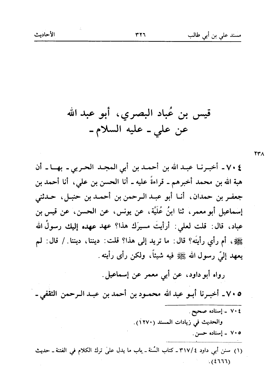 704 - أخبرنَا عبد الله بْنُ أَحْمَدَ بْنِ أَبِي الْمَجْدِ الْحَرْبِيُّ بِهَا أَنَّ هِبَةَ اللَّهِ بْنَ مُحَمَّدٍ أَخْبَرَهُمْ قِرَاءَةً عَلَيْهِ أَنا الْحَسَنُ بْنُ عَلِيٍّ أَنا أَحْمَدُ بن جَعْفَر بن حمدَان أَنا أَبُو عبد الرَّحْمَن بْنُ أَحْمَدَ بْنِ حَنْبَلٍ حَدَّثَنِي إِسْمَاعِيلُ أَبُو مَعْمَرٍ ثَنَا ابْنُ عُلَيَّةَ عَنْ يُونُسَ عَنِ الْحَسَنِ عَنْ قَيْسِ بْنِ عَبَّادٍ قَالَ قُلْتُ لِعَلِيٍّ أَرَأَيْتَ مَسِيرَكَ هَذَا عَهْدٌ عَهِدَهُ إِلَيْكَ رَسُولَ اللَّهِ صَلَّى اللَّهُ عَلَيْهِ وَسَلَّمَ أَمْ رَأْيٌ رَأَيْتَهُ قَالَ مَا تُرِيدُ إِلَى هَذَا قُلْتُ دِينَنَا دِينَنَا قَالَ لَمْ يَعْهَدْ إِلَيَّ رَسُولُ اللَّهِ صَلَّى اللَّه عَلَيْهِ وَسَلَّمَ فِيهِ شَيْئًا وَلَكِنْ رَأْيٌ رَأَيْتُهُ