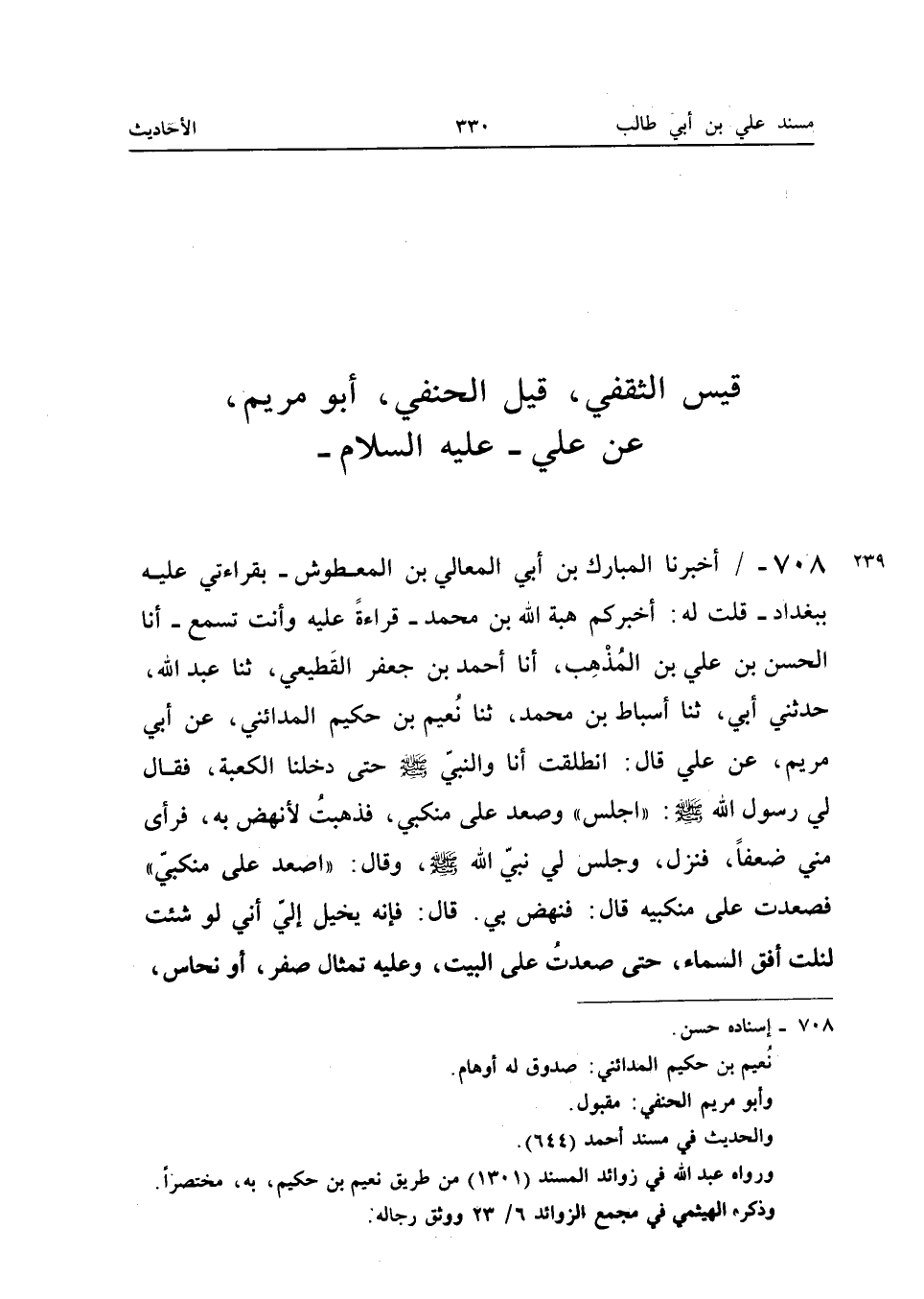 708 - أَخْبَرَنَا الْمُبَارَكُ بْنُ أَبِي الْمَعَالِي بْنِ الْمَعْطُوشِ بِقِرَاءَتِي عَلَيْهِ بِبَغْدَادَ قُلْتُ لَهُ أَخْبَرَكُمْ هِبَةُ اللَّهِ بْنُ مُحَمَّدٍ قِرَاءَةً عَلَيْهِ وَأَنْتَ تَسْمَعُ أَنا الْحَسَنُ بْنُ عَلِيِّ بن الْمَذْهَب أَنا أَحْمد بن جَعْفَر الْقطيعِي ثَنَا عبد الله حَدَّثَنِي أَبِي ثَنَا أَسْبَاطُ بْنُ مُحَمَّدٍ ثَنَا نُعَيْمُ بْنُ حَكِيمٍ الْمَدَائِنِيُّ عَنْ أَبِي مَرْيَمَ عَنْ عَلِيٍّ قَالَ انْطَلَقْتُ أَنَا وَالنَّبِيُّ صَلَّى اللَّه عَلَيْهِ وَسَلَّمَ حَتَّى دَخَلْنَا الْكَعْبَةَ فَقَالَ لِي رَسُولُ اللَّهِ صَلَّى اللَّهُ عَلَيْهِ وَسَلَّمَ اجْلِسْ وَصَعِدَ عَلَى مَنْكِبَيَّ فَذَهَبْتُ لأَنْهَضَ بِهِ فَرَأَى مِنِّي ضَعْفًا فَنَزَلَ وَجَلَسَ لِي نَبِيُّ اللَّهِ صَلَّى اللَّه عَلَيْهِ وَسَلَّمَ وَقَالَ اصْعَدْ عَلَى مَنْكِبَيَّ فَصَعِدْتُ عَلَى مَنْكِبَيْهِ قَالَ فَنَهَضَ بِي قَالَ فَإِنَّهُ يُخَيَّلُ إِلَيَّ أَنِّي لَوْ شِئْتُ لَنِلْتُ أُفُقَ السَّمَاءَ حَتَّى صَعِدْتُ عَلَى الْبَيْتَ وَعَلَيْهِ تِمْثَالُ صُفْرٍ أَوْ نُحَاسٍ