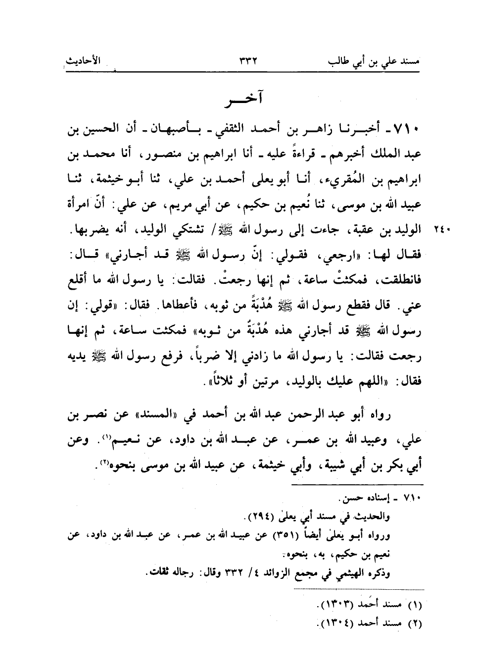 710 - أَخْبَرَنَا زَاهِرُ بْنُ أَحْمَدَ الثَّقَفِيُّ بِأَصْبَهَانَ أَن الْحُسَيْن بن عبد الْملك أَخْبَرَهُمْ قِرَاءَةً عَلَيْهِ أَنا إِبْرَاهِيمُ بْنُ مَنْصُورٍ أَنا مُحَمَّد بن إِبْرَاهِيم بن الْمُقْرِئ أَنا أبويعلى أَحْمَدُ بْنُ عَلِيٍّ ثَنَا أَبُو خَيْثَمَةَ ثَنَا عبيد الله بْنُ مُوسَى ثَنَا نُعَيْمُ بْنُ حَكِيمٍ عَنْ أَبِي مَرْيَمَ عَنْ عَلِيٍّ أَنَّ امْرَأَةَ الْوَلِيدِ بْنِ عُقْبَةَ جَاءَتْ إِلَى رَسُولِ اللَّهِ صَلَّى اللَّه عَلَيْهِ وَسَلَّمَ تَشْتَكِي الْوَلِيدَ أَنَّهُ يَضْرِبُهَا فَقَالَ لَهَا ارْجِعِي فَقُولِي إِنَّ رَسُولَ اللَّهِ صَلَّى اللَّه عَلَيْهِ وَسَلَّمَ قَدْ أَجَارَنِي قَالَ فَانْطَلَقَتْ فَمَكَثَتْ سَاعَةً ثُمَّ إِنَّهَا رَجَعَتْ فَقَالَتْ يَا رَسُولَ اللَّهِ مَا أَقْلَعَ عَنِّي قَالَ فَقَطَعَ رَسُولُ اللَّهِ صَلَّى اللَّه عَلَيْهِ وَسَلَّمَ هُدْبَةً مِنْ ثَوْبِهِ فَأَعْطَاهَا فَقَالَ قُولِي إِنَّ رَسُولَ اللَّهِ صَلَّى اللَّهُ عَلَيْهِ وَسَلَّمَ قَدْ أَجَارَنِي هَذِهِ هُدْبَةً مِنْ ثَوْبِهِ فَمَكَثَتْ سَاعَةً ثُمَّ إِنَّهَا رَجَعَتْ فَقَالَتْ يَا رَسُولَ اللَّهِ مَا زَادَنِي إِلَّا ضَرْبًا فَرَفَعَ رَسُولُ اللَّهِ صَلَّى اللَّه عَلَيْهِ وَسَلَّمَ يَدَيْهِ فَقَالَ اللَّهُمَّ عَلَيْكَ بِالْوَلِيدِ مَرَّتَيْنِ أَوْ ثَلاثًا