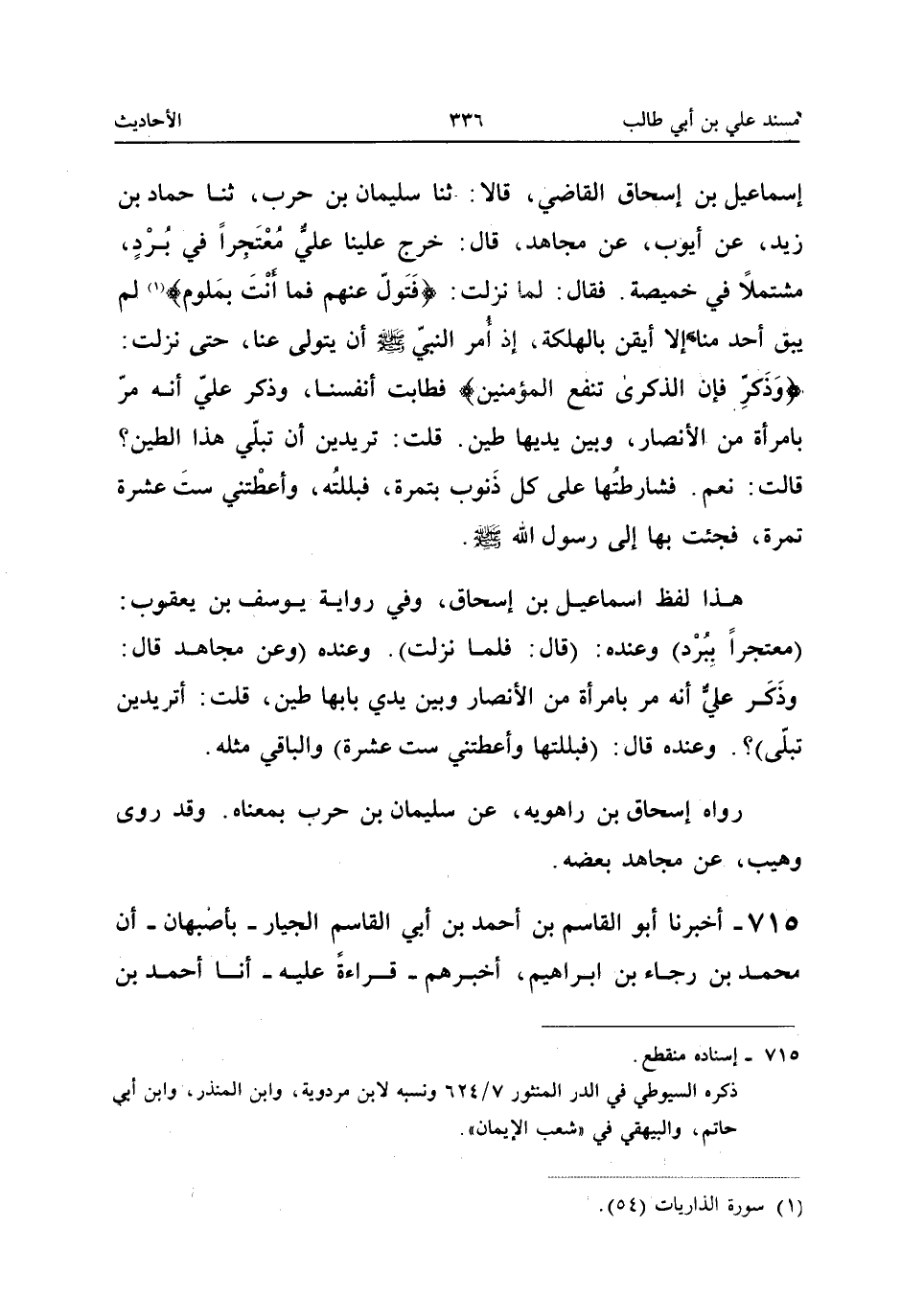 إِسْمَاعِيلُ بْنُ إِسْحَاقَ الْقَاضِي قَالا ثَنَا سُلَيْمَانُ بْنُ حَرْبٍ ثَنَا حَمَّادُ بْنُ زَيْدٍ عَنْ أَيُّوبَ عَنْ مُجَاهِدٍ قَالَ خَرَجَ عَلَيْنَا عَلِيٌّ مُعْتَجِرًا فِي بُرْدٍ مُشْتَمِلا فِي خَمِيصَةٍ فَقَالَ لَمَّا نَزَلَتْ {فَتَوَلَّ عَنْهُمْ فَمَا أَنْتَ بِمَلُومٍ} لَمْ يَبْقَ أَحَدٌ مِنَّا إِلَّا أَيْقَنَ بِالْهَلَكَةِ إِذْ أُمِرَ النَّبِيُّ صَلَّى اللَّه عَلَيْهِ وَسَلَّمَ أَنْ يَتَوَلَّى عَنَّا حَتَّى نَزَلَتْ {وَذَكِّرْ فَإِنَّ الذكرى تَنْفَع الْمُؤمنِينَ} فَطَابَتْ أَنْفُسُنَا وَذَكَرَ عَلِيٌّ أَنَّهُ مَرَّ بِامْرَأَةٍ مِنَ الأَنْصَارِ وَبَيْنَ يَدَيْهَا طِينٌ قُلْتُ تُرِيدِينَ أَنْ تَبُلِّيَ هَذَا الطِّينَ قَالَتْ نَعَمْ فَشَارَطْتُهَا عَلَى كُلِّ ذَنُوبٍ بِتَمْرَةٍ فَبَلَلْتُهُ وَأَعْطَتْنِي سِتَّ عَشْرَةَ تَمْرَةً فَجِئْتُ بِهَا إِلَى رَسُولِ اللَّهِ صَلَّى اللَّه عَلَيْهِ وَسَلَّمَ